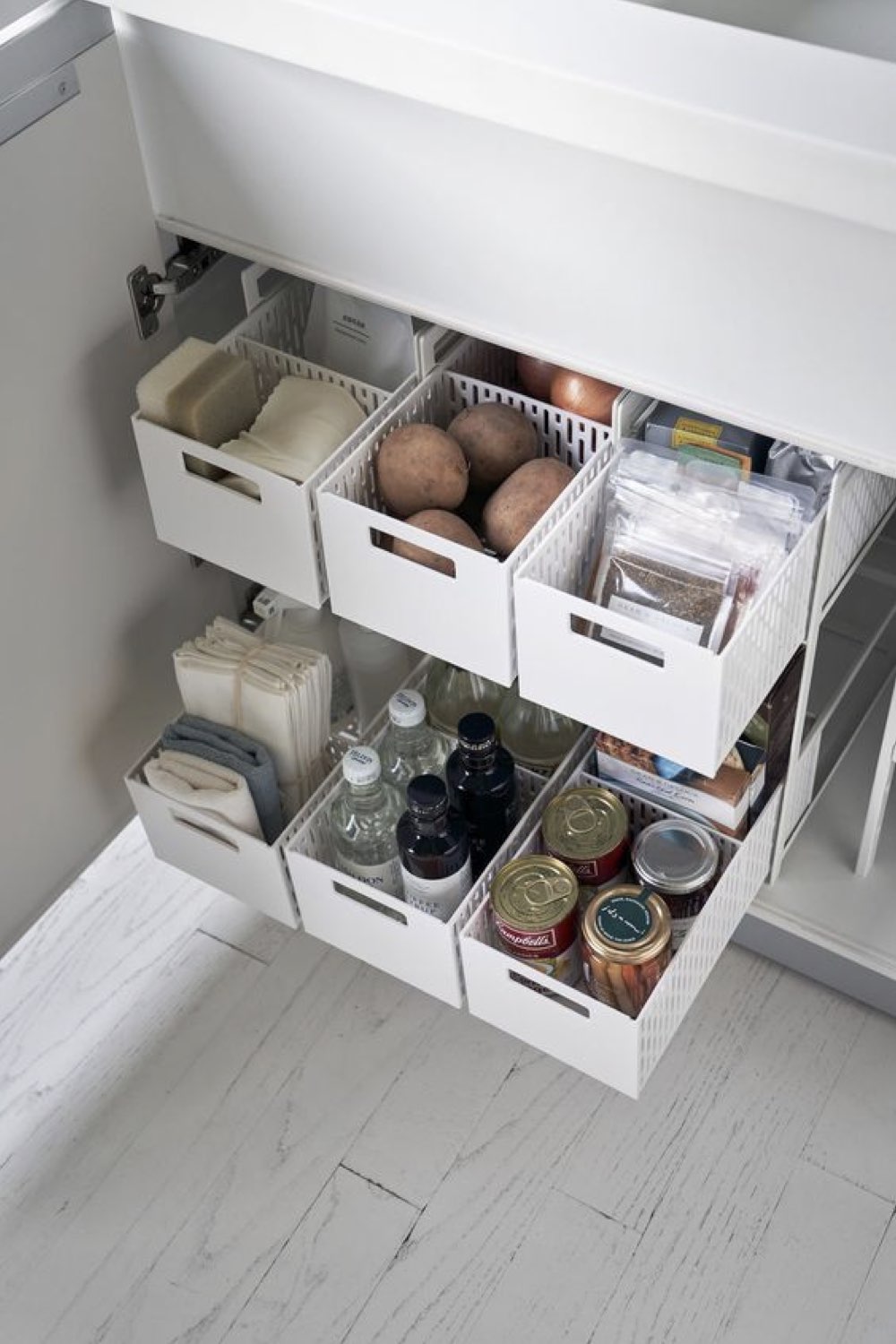 Avoir une pièce dédiée au garde-manger n'est pas donné à tout le monde. En général, les courses alimentaires trouvent leur place dans le frigo et dans l'un des meubles de la cuisine. Pour éviter que tout ne se mélange, rien de mieux que de choisir de petits paniers sans couvercle.