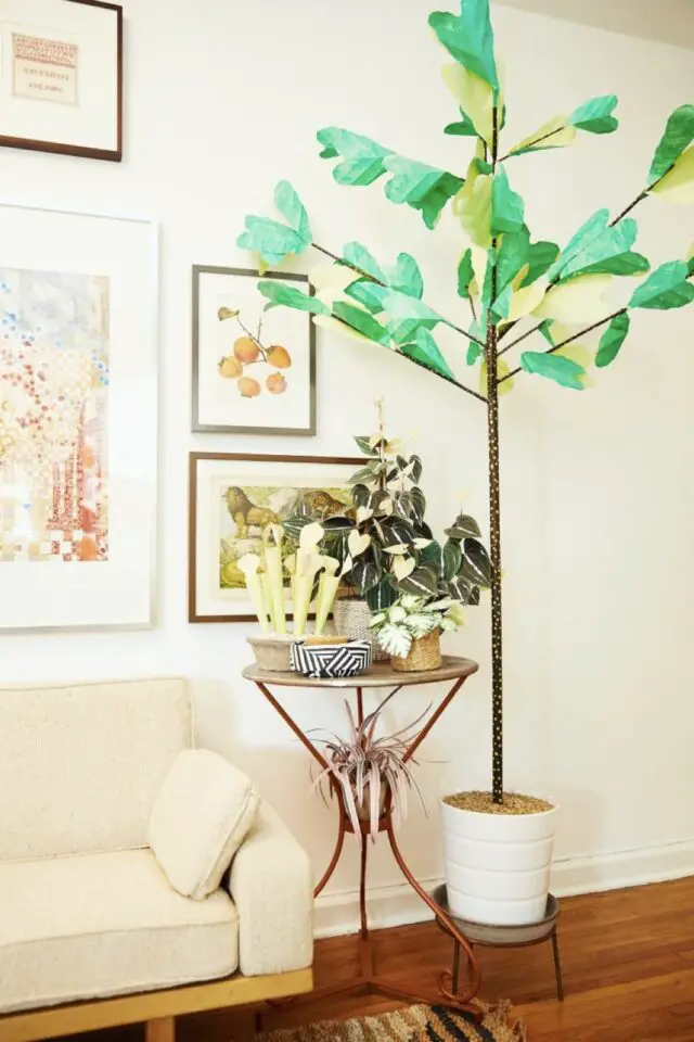 La création que ce soit un loisir ou une activité professionnelle prend parfois beaucoup de place. Et c'est ce qui m'a interpellé dans cet appartement. La création fait partie de la décoration. On trouve des plantes vertes en papier partout. Ces fameuses plantes répondent également à une spécificité de l'appartement: le salon n'a pas de lumière naturelle directe. C'est parfois un frein pour installer certaines variétés de plantes mais si elles sont en papier et confectionnées à la main, ce n'est plus un problème. Ce qui me parle beaucoup aussi c'est que ces plantes ne demandent pas d'entretien. Et c'est parfait pour les gens comme moi qui n'ont pas la main verte.