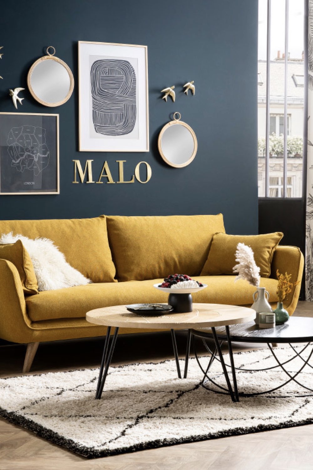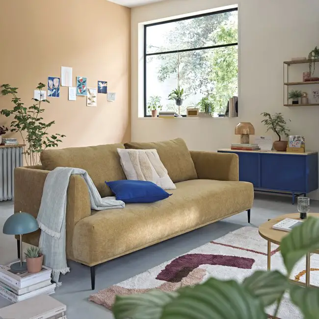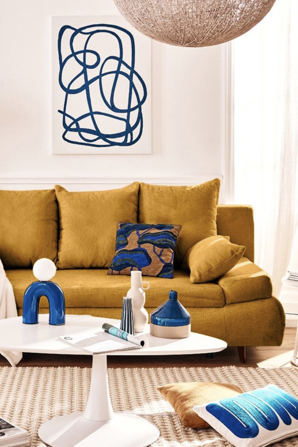 - Un canapé jaune ocre s'inscrit dans la même dynamique que le jaune moutarde. Une couleur organique, chaleureuse et élégante.