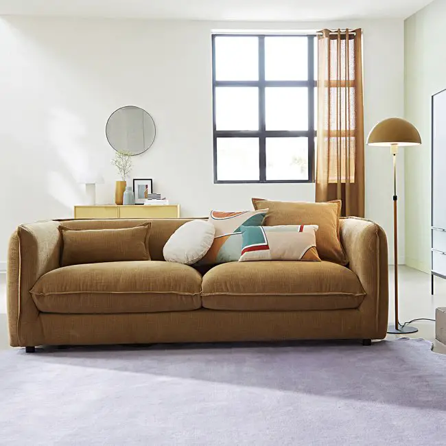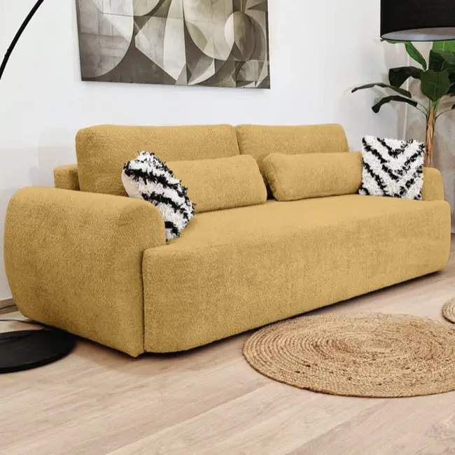 La nuance de jaune n'est pas le seul élément à prendre en compte pour choisir votre nouveau canapé. Le textile qui le compose va également influencer l'effet déco dans l'espace. On trouve facilement des canapés jaunes en velours. Ils sont intéressant parce que le velours est un textile lumineux. Pour un côté cosy, je vous conseille de partir par exemple sur un canapé bouclette. Même si les bouclettes sont souvent dans des tonalités beiges et écrus, elles existent aussi en jaune. Plus commun, il y a le polyester, le coton ou le lin. Ce sont des textiles faciles à vivre au quotidien.
