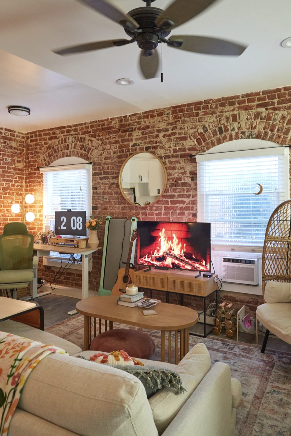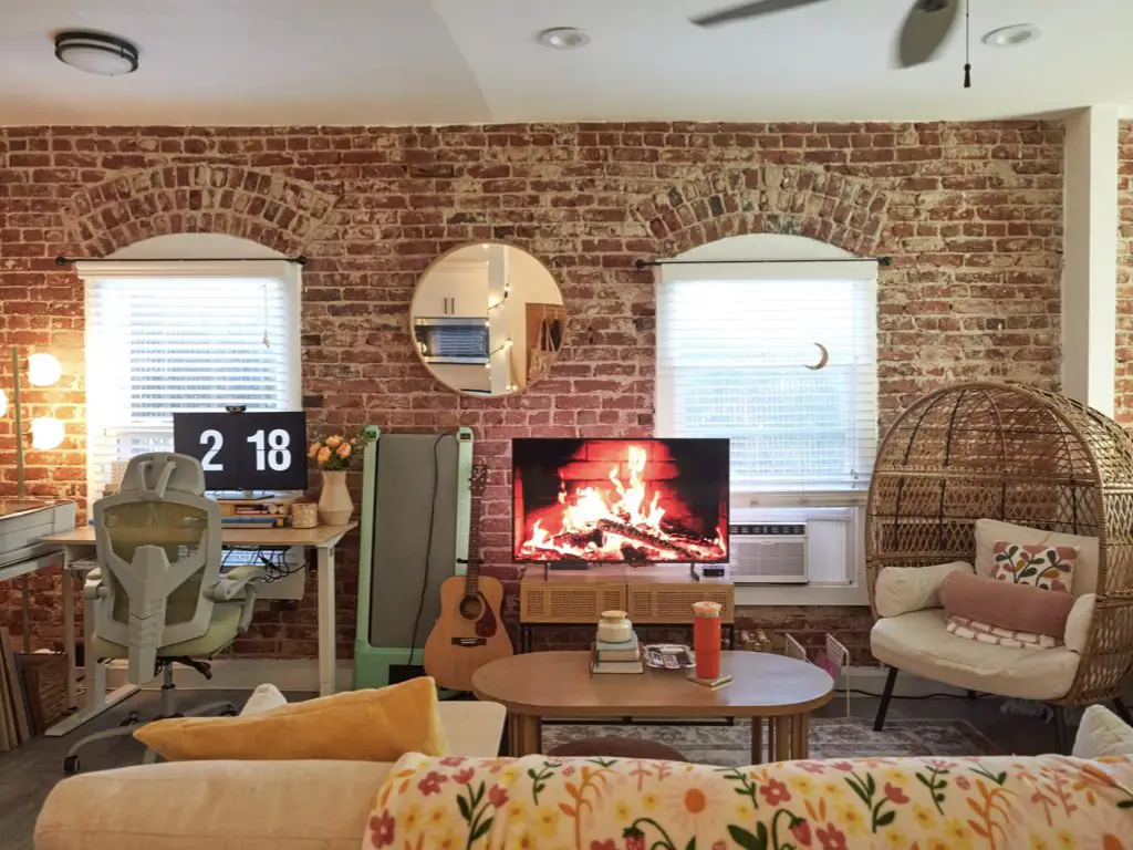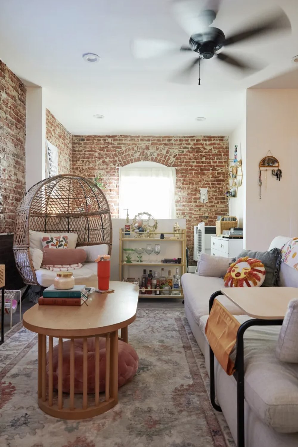 Niveau déco et mobilier, c'est pour moi un peu trop mais cela n'empêche pas que je sache apprécier la personnalité qui se dégage de ce studio. Les murs sont blancs et en briques, ces dernières apportent un côté authentique et chaleureux aux 40m2. Cette chaleur du matériau combiné à un petit espace crée une base cosy. Cette base est personnalisée avec des meubles et de la déco dans l'air du temps. Le maximalisme joue en faveur de l'esprit bohème. Et à mes yeux, le point central de ce décor est le fauteuil boule sur pied qui associe confort et esprit boho.