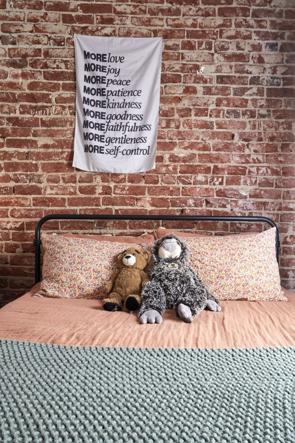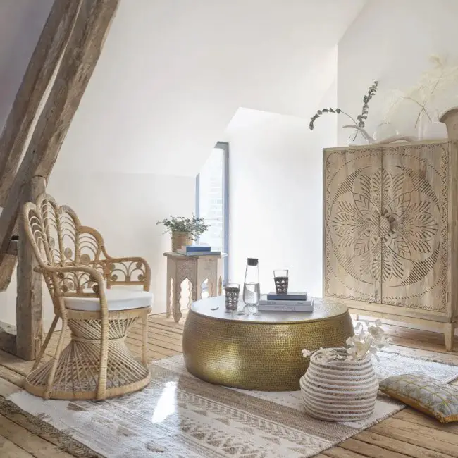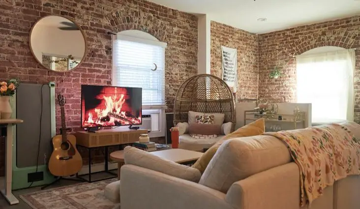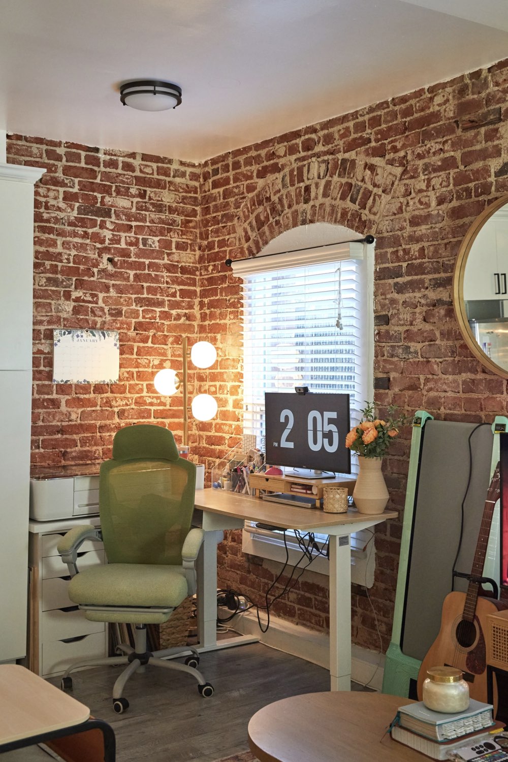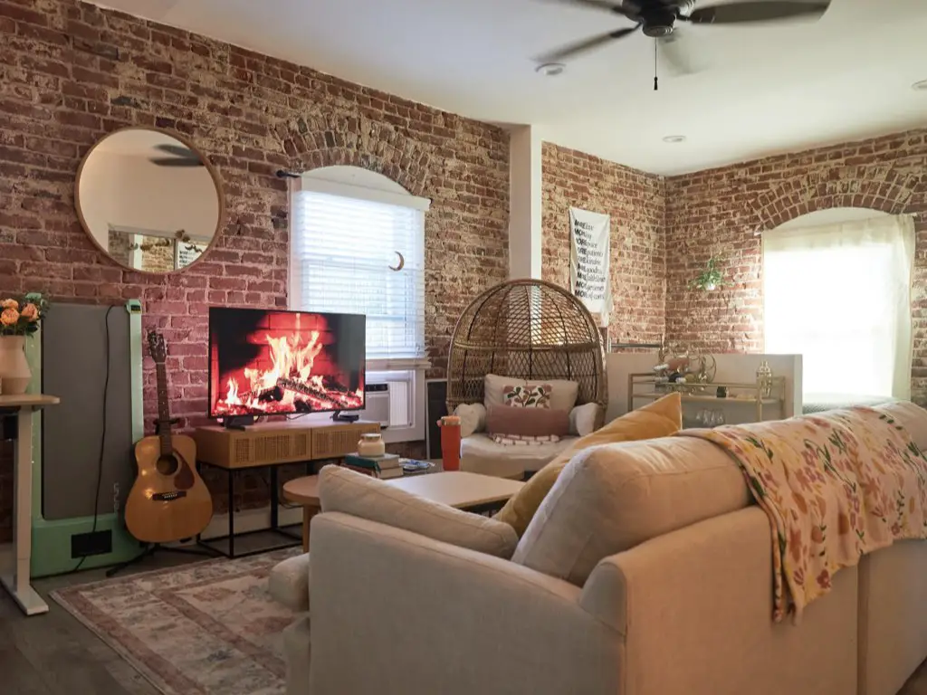 Niveau déco et mobilier, c'est pour moi un peu trop mais cela n'empêche pas que je sache apprécier la personnalité qui se dégage de ce studio. Les murs sont blancs et en briques, ces dernières apportent un côté authentique et chaleureux aux 40m2. Cette chaleur du matériau combiné à un petit espace crée une base cosy. Cette base est personnalisée avec des meubles et de la déco dans l'air du temps. Le maximalisme joue en faveur de l'esprit bohème. Et à mes yeux, le point central de ce décor est le fauteuil boule sur pied qui associe confort et esprit boho.