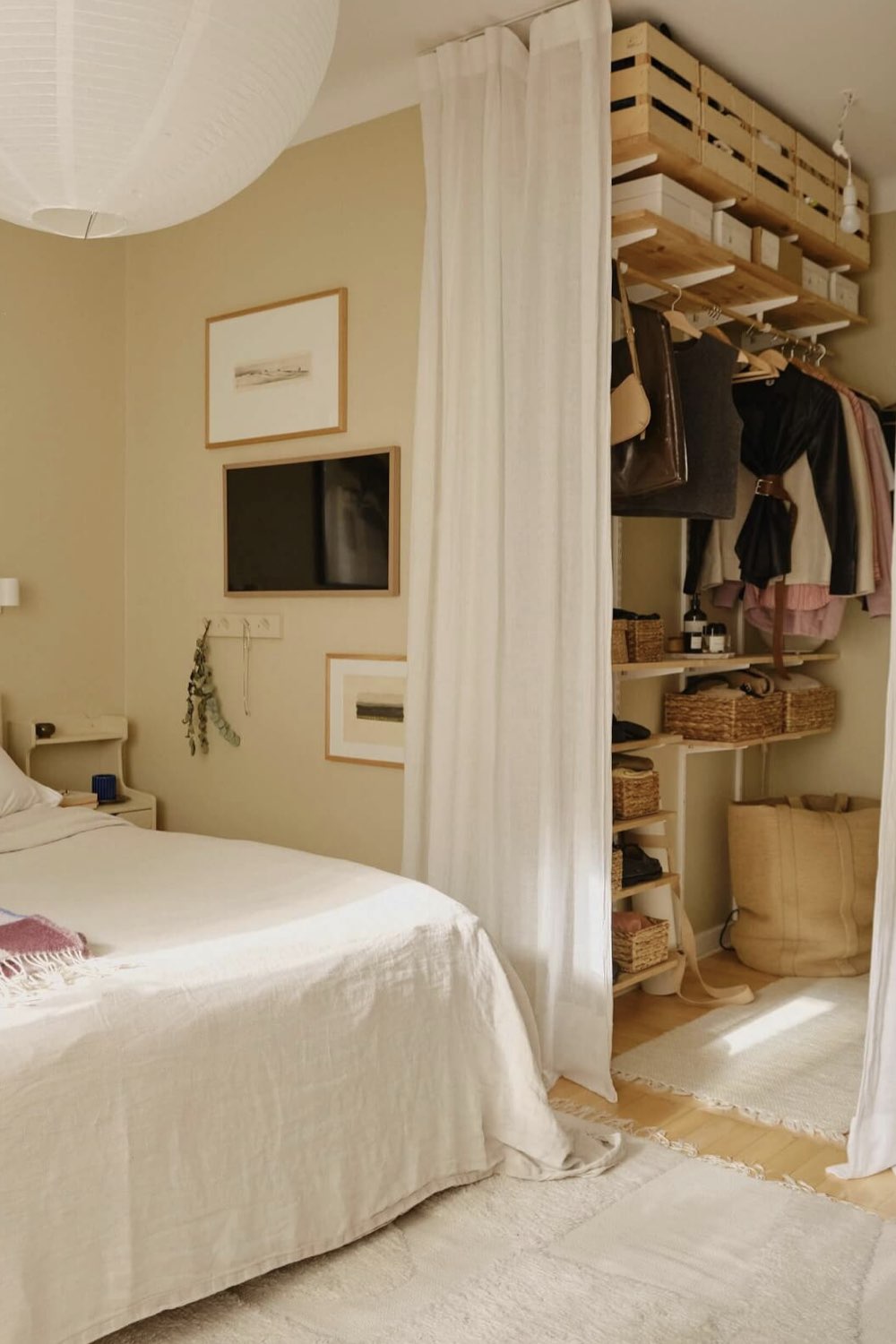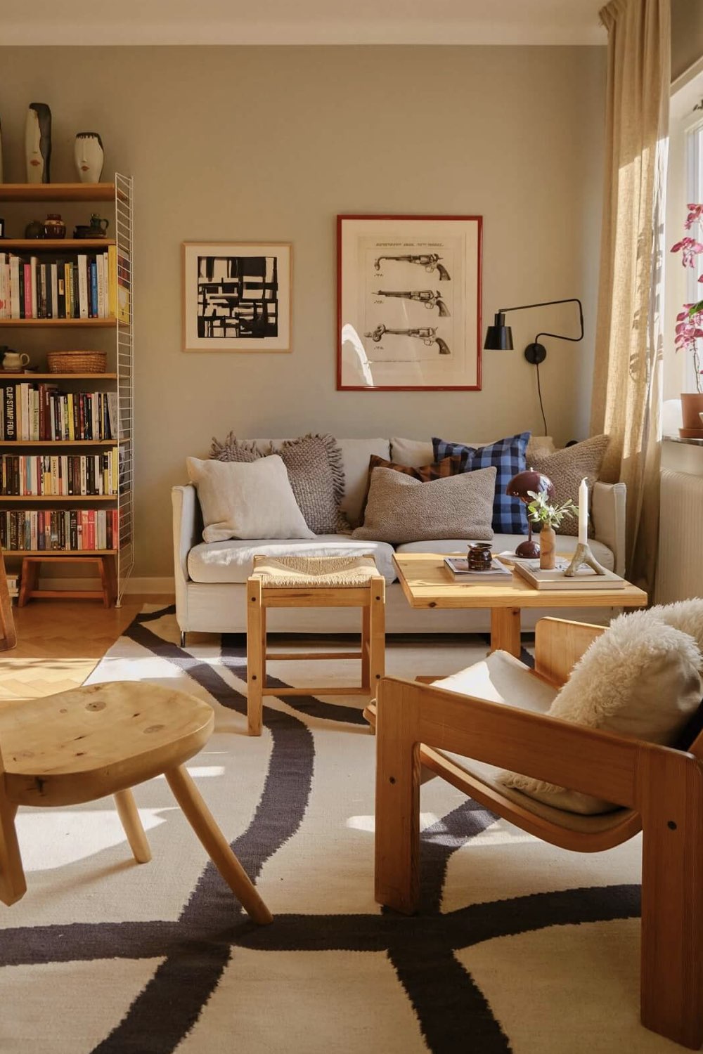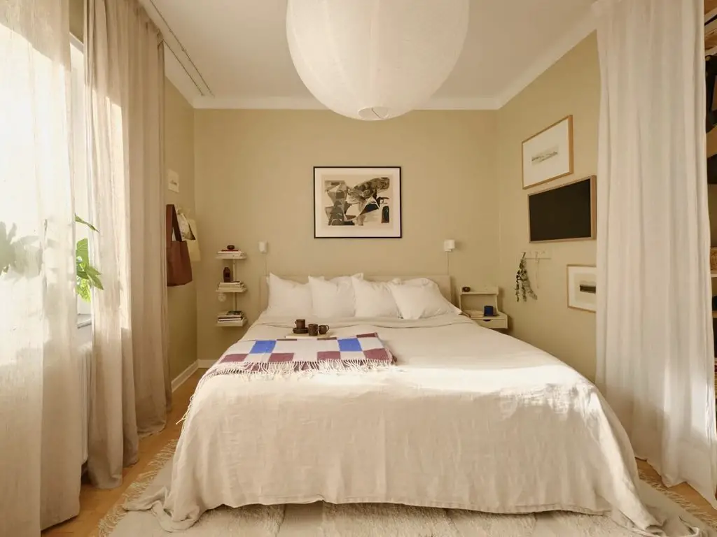Il y a de nombreuses manières de créer un environnement calme qui nous invite à être plus serein•e. Dans cet appartement, les couleurs neutres jouent un grand rôle. Elles sont les couleurs dominantes dans la plupart des espaces. Le beige est enveloppant, doux et lumineux. Il est associé au blanc que l'on retrouve sur les plafonds, les encadrements de fenêtres, le plan de travail de la cuisine. Le beige est aussi marié avec du bois (au sol, sur les meubles). Cette palette de matériaux et de couleurs crée un cadre simple mais cosy. Et je ne sais pas pour vous mais la simplicité m'apaise.
