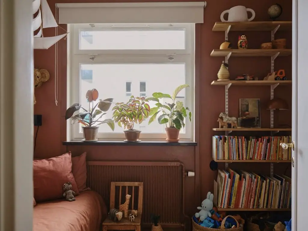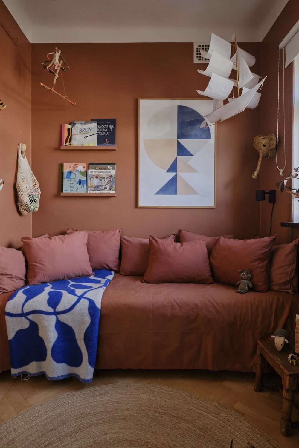 Alors que la chambre parentale est aux couleurs de la pièce de vie, la chambre d'enfant est radicalement différente du reste de l'appartement et c'est grâce / à cause de la couleur. La chambre est entièrement de couleur terracotta. La peinture des murs, celle du radiateur, la couleur du linge de lit. Ce monochrome est chaleureux et enveloppant.