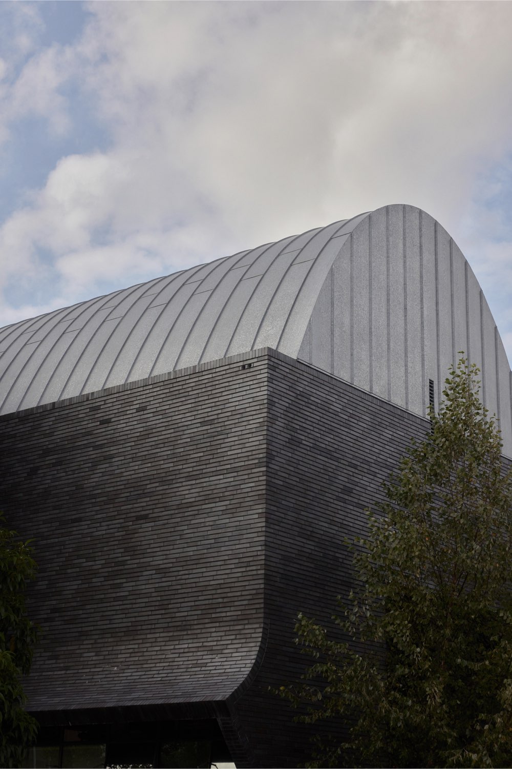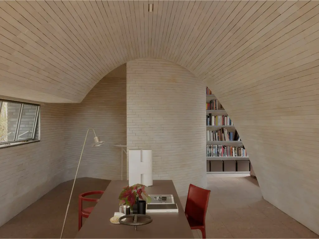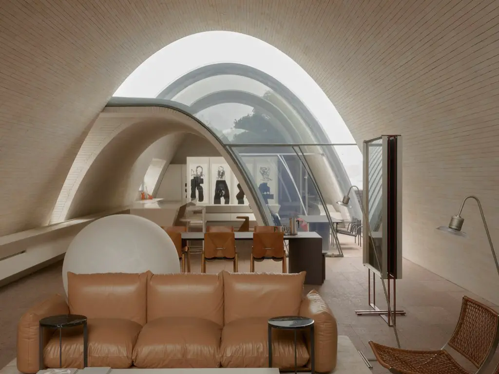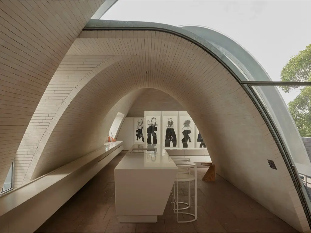 Ce logement / bureau est situé dans une zone réglementée. L'architecte et propriétaire a du suivre un cahier des charges spécifique pour intégrer son projet à l'environnement. De l'extérieur, il est impossible d'imaginer ce qui se trouve à l'intérieur. On voit des murs couverts de briquettes grises et élégantes en façade, un mur courbe en pavés de verre, un toit cylindrique. En passant et en ne sachant pas ce qui se trouve à l'intérieur, on pourrait y voir une certaine forme d'austérité.