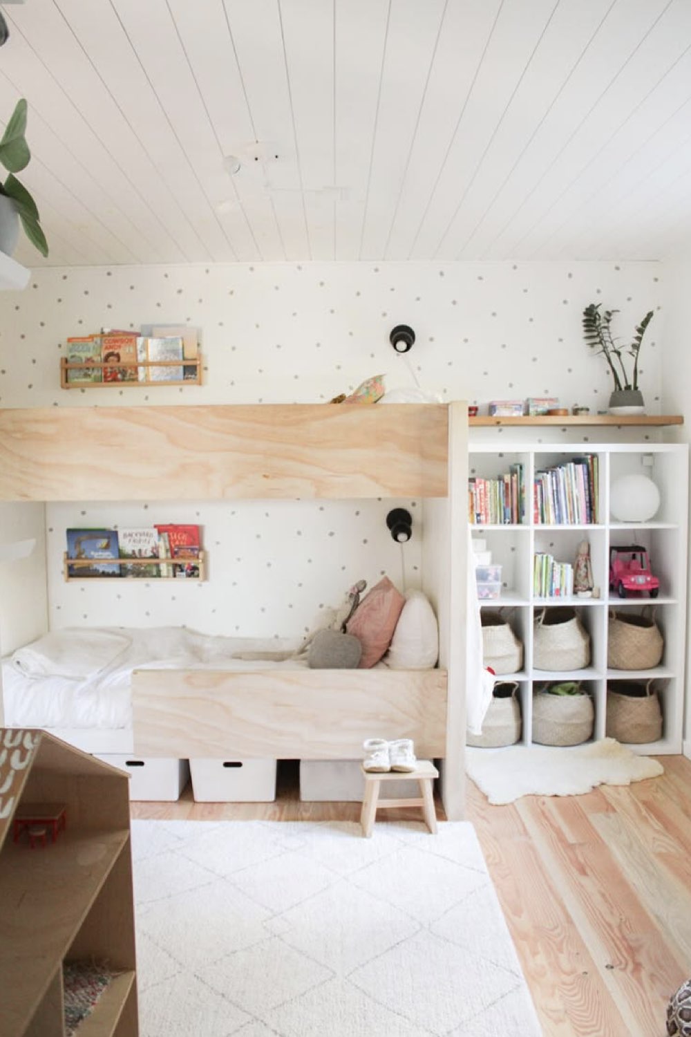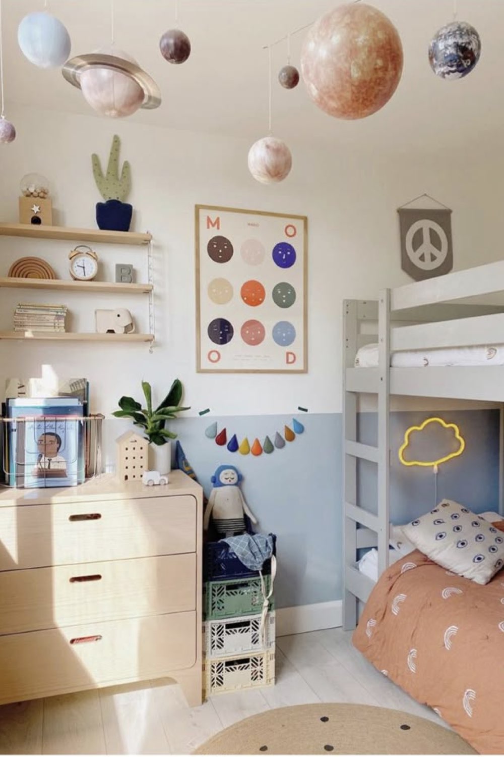 Et puis, il y a la question des bibliothèques et meubles de rangements pour les jouets. Même si l'idéal est de désencombrer la chambre un maximum pour que ce soit agréable pour les enfants, on ne peut pas passer au dessus de cette question de rangement. On a déjà plusieurs meubles hauts (le lit superposé + la ou les armoires). Pour une question d'équilibre visuel, il est préférable de partir sur des meubles bas qui seront plus léger.
