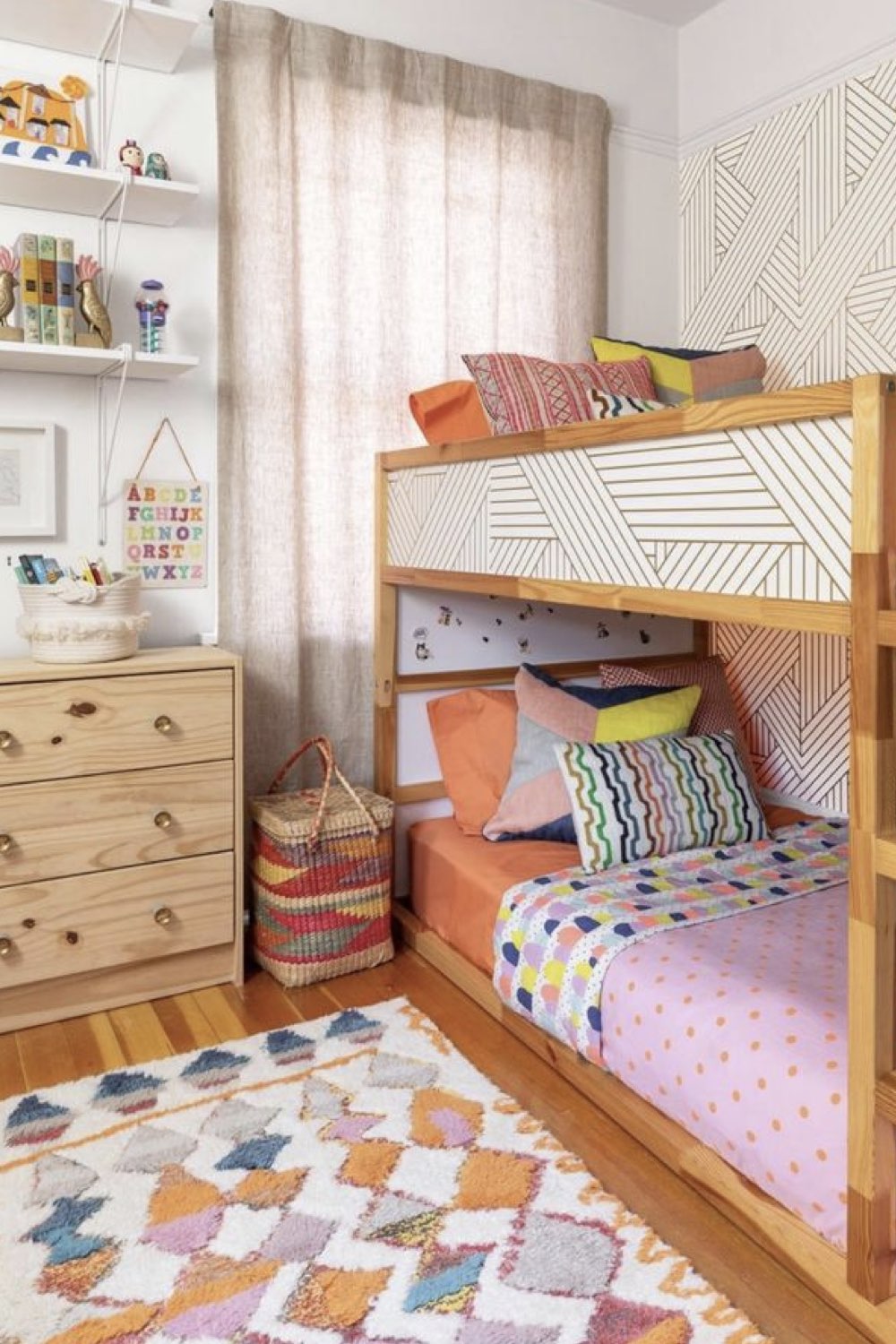 Un espace carré - même s'il ne fait que 9m2 - offre un peu plus de possibilités quant à l'emplacement du lit. On peut par exemple positionner le lit au centre de la pièce pour créer cet aménagement en symétrie dont je parlais plus haut. Chaque enfant a un côté de la chambre pour lui.