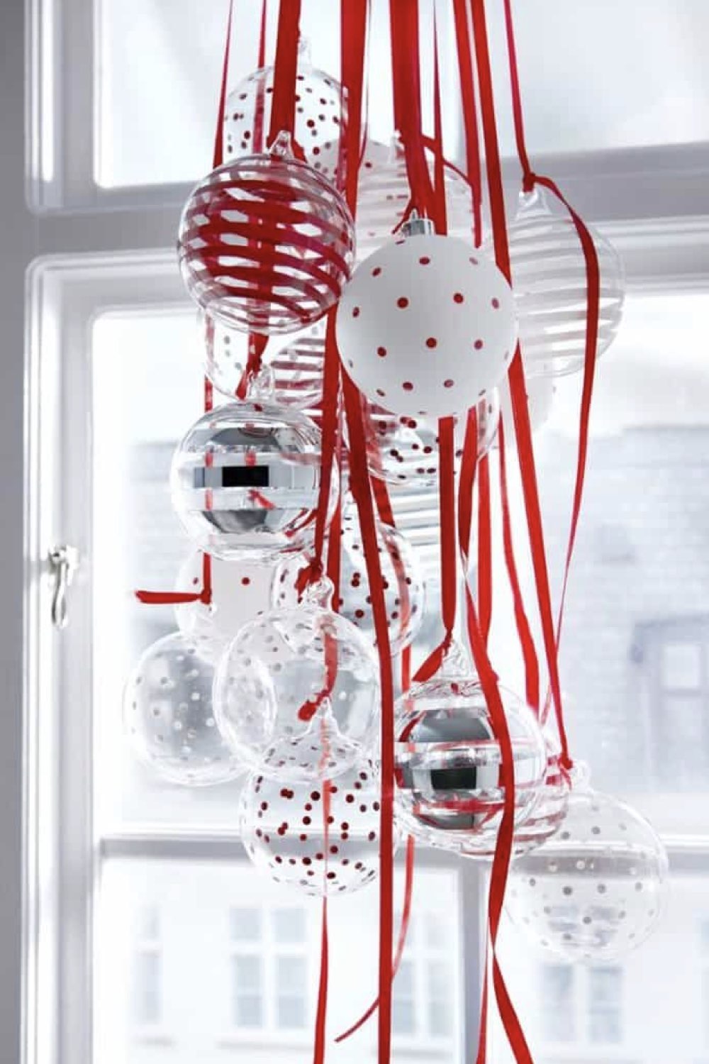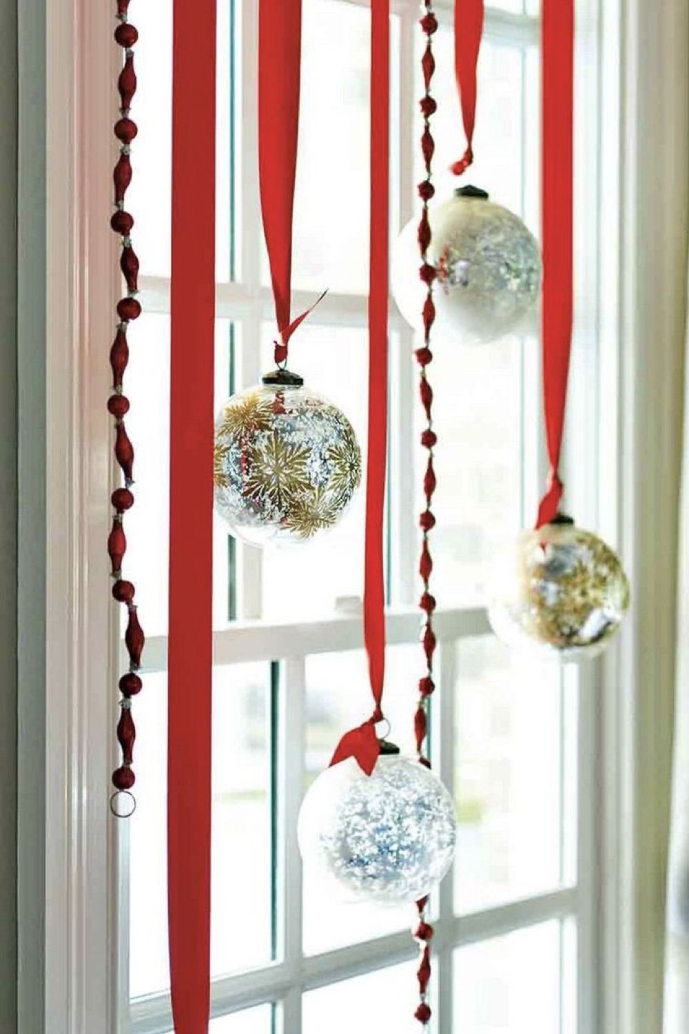 - Suspendre des boules de noël à la fenêtre avec du ruban coloré;