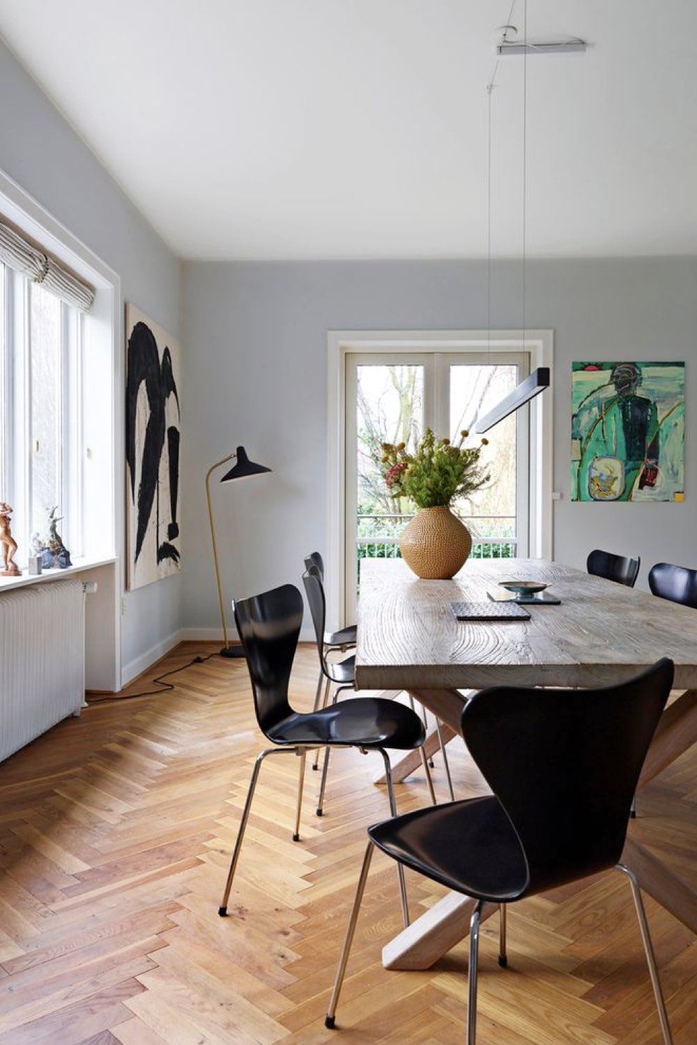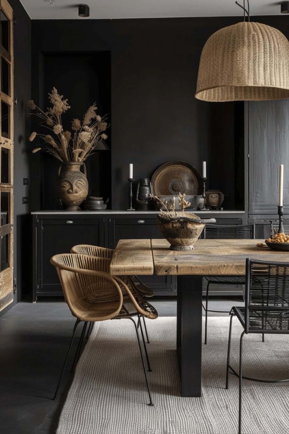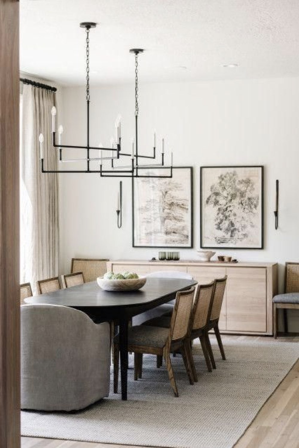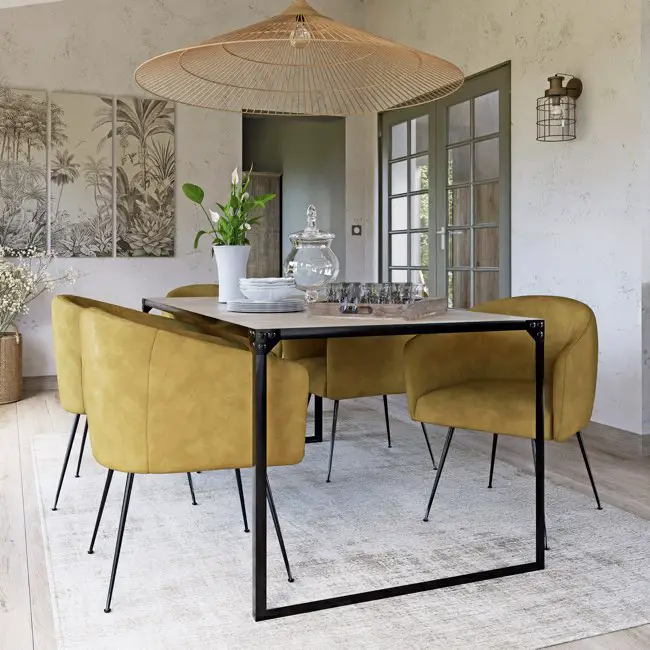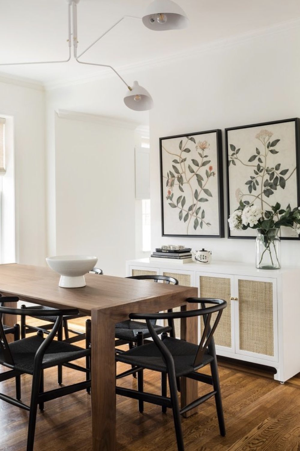Plus discret que le bois mais assez facilement trouvable dans la salle à manger: le métal noir. Pieds de chaises, piètement de table, meubles ou encore luminaires. Il y a un vaste choix. Le noir comme couleur dominante n'est pas fait pour tout le monde (même pour moi, ça pourrait être too much). En revanche, le noir comme couleur accent vous permettra de souligner certains détails de votre décor. C'est un procédé que l'on voit fréquemment dans les intérieurs Japandi par exemple.