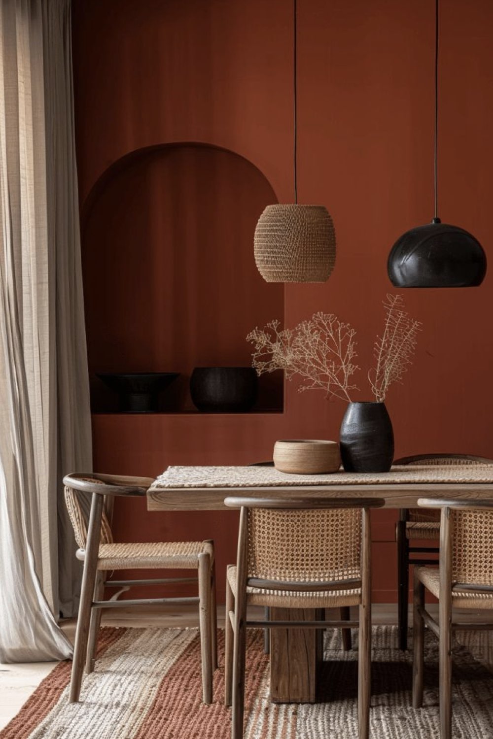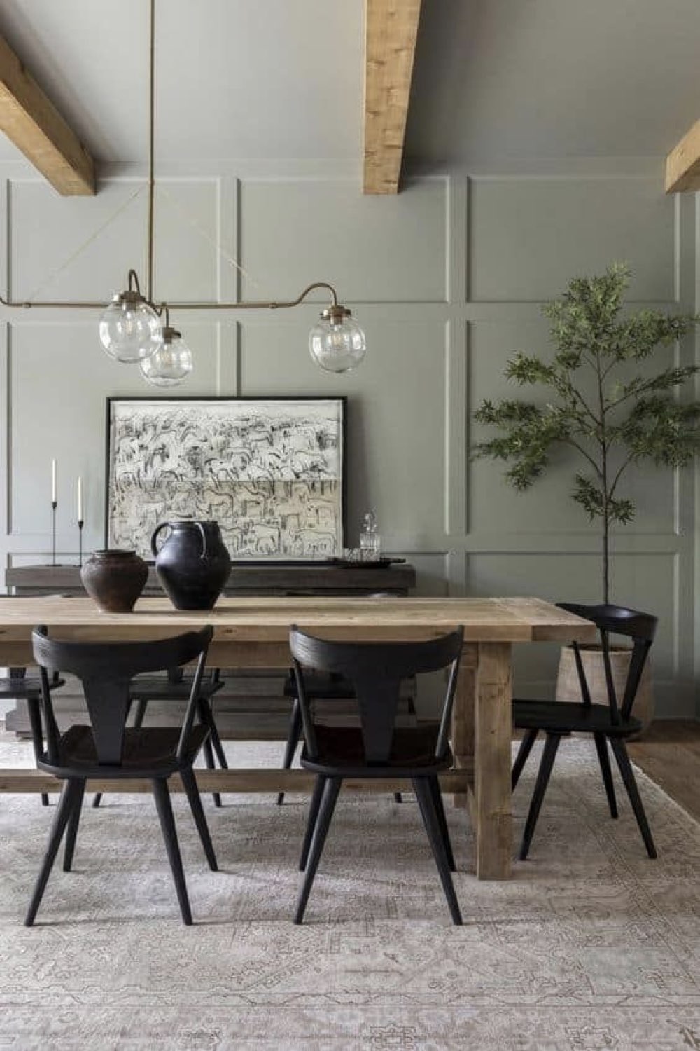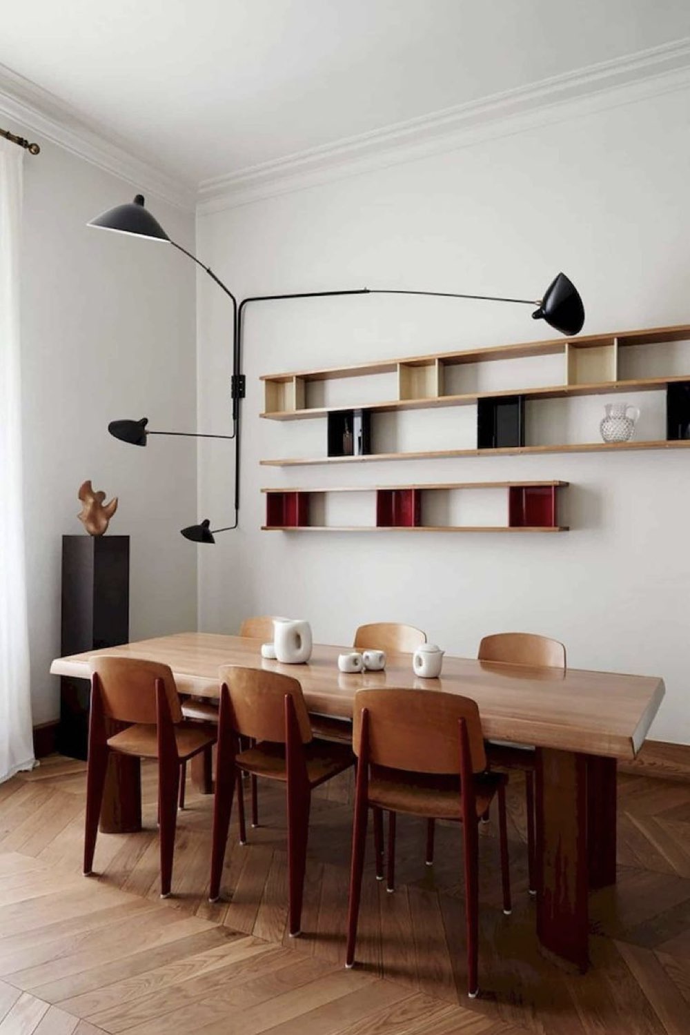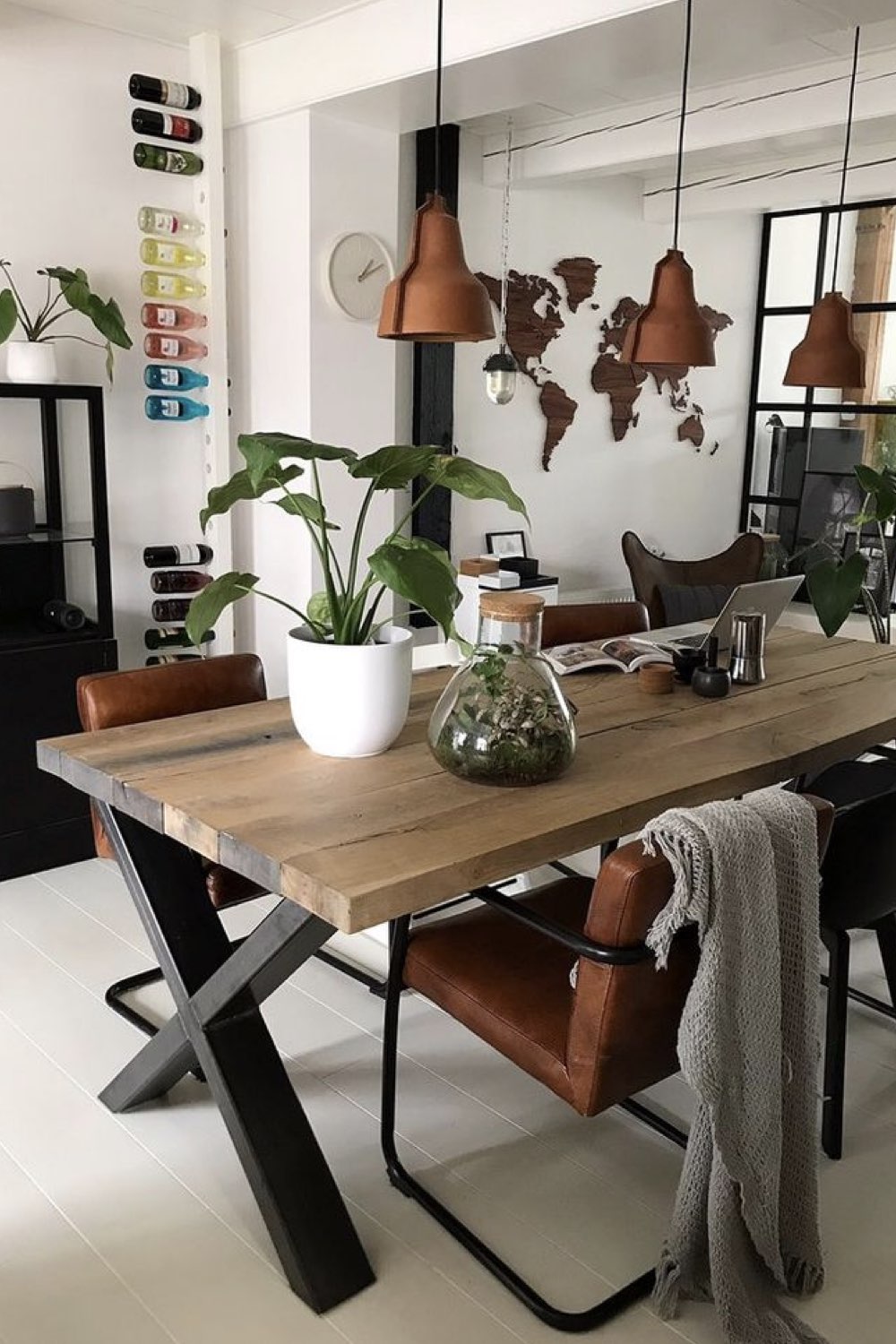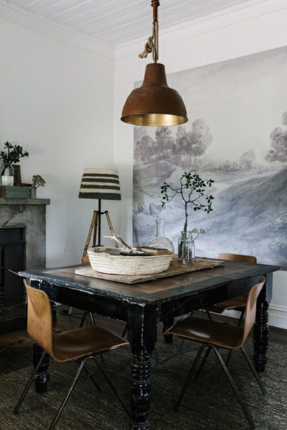 Plus discret que le bois mais assez facilement trouvable dans la salle à manger: le métal noir. Pieds de chaises, piètement de table, meubles ou encore luminaires. Il y a un vaste choix. Le noir comme couleur dominante n'est pas fait pour tout le monde (même pour moi, ça pourrait être too much). En revanche, le noir comme couleur accent vous permettra de souligner certains détails de votre décor. C'est un procédé que l'on voit fréquemment dans les intérieurs Japandi par exemple.