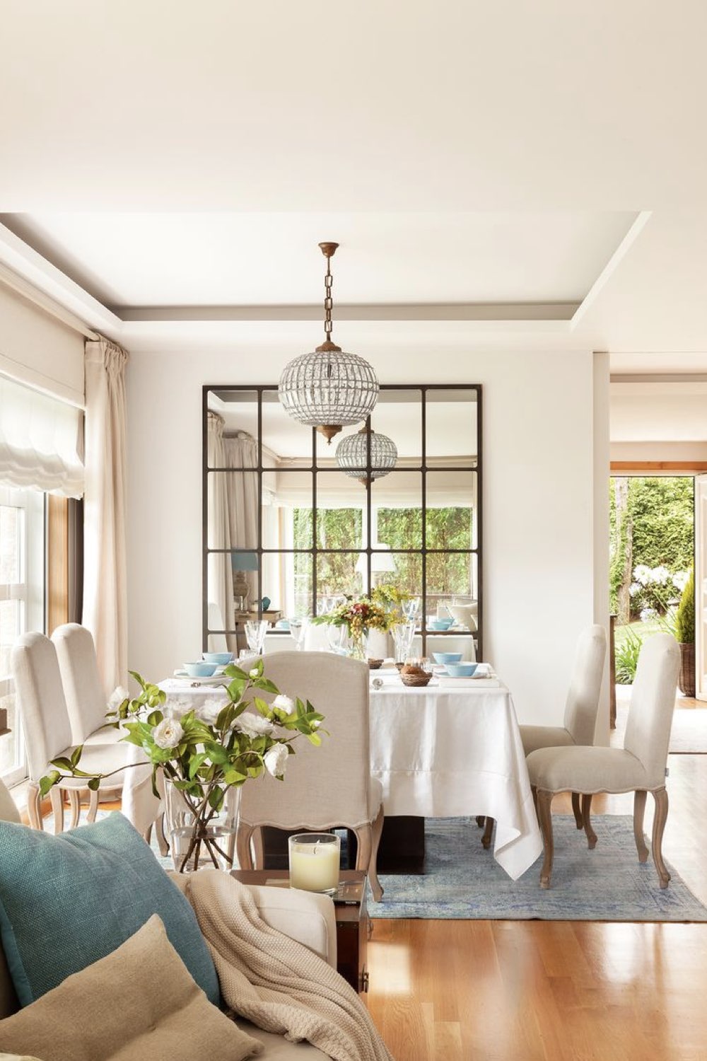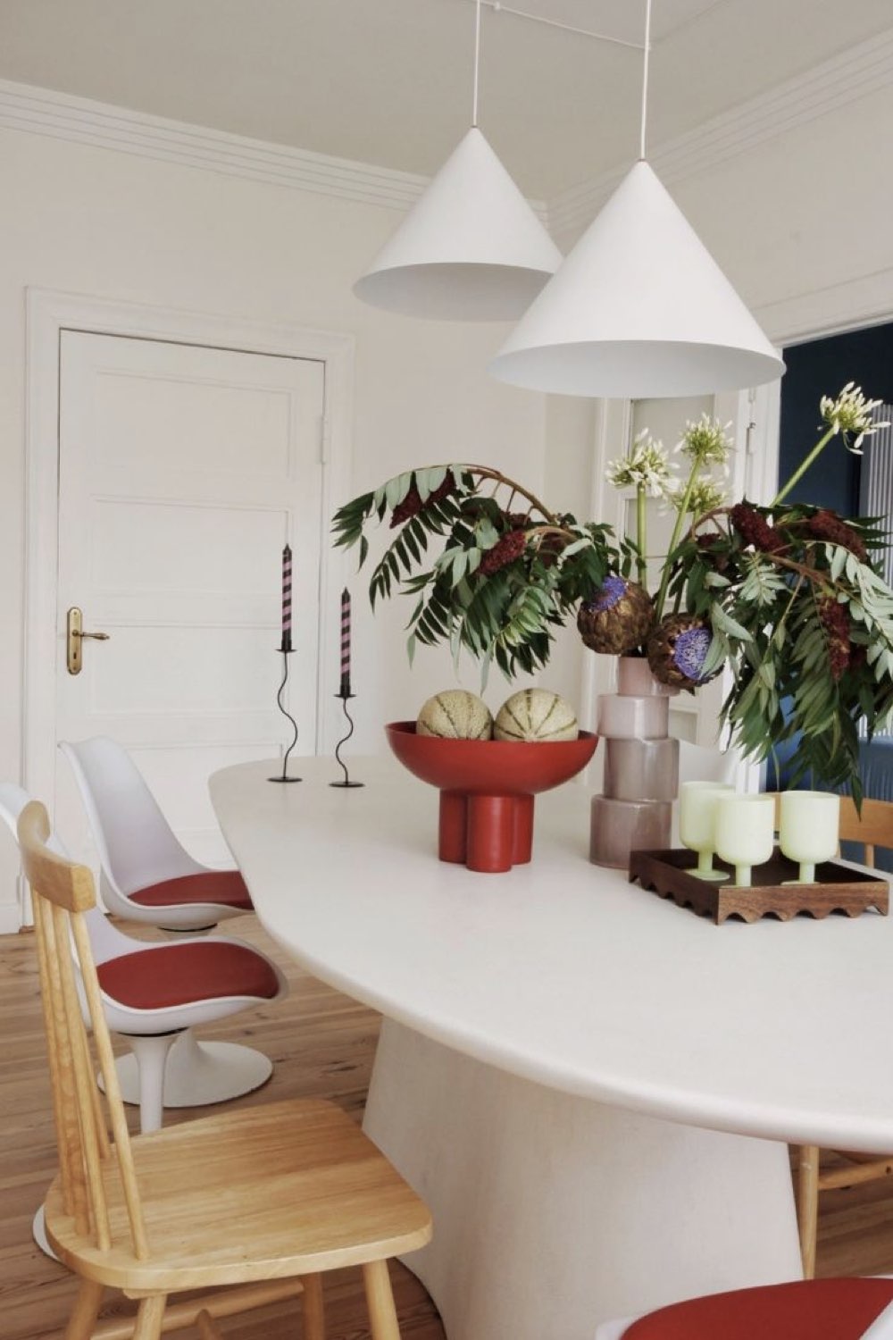 Je suis une grande fan des murs blancs dans la salle à manger (et un peu partout dans la maison). A mes yeux c'est comme une toile blanche qui ne demande qu'à être personnalisée. La couleur à proprement parlé peut arriver comme couleur secondaire ou comme couleur accent. Je parlais de chaises dépareillées et / ou relookées plus haut, c'est une des manières possibles pour dynamiser une pièce blanche / neutre.