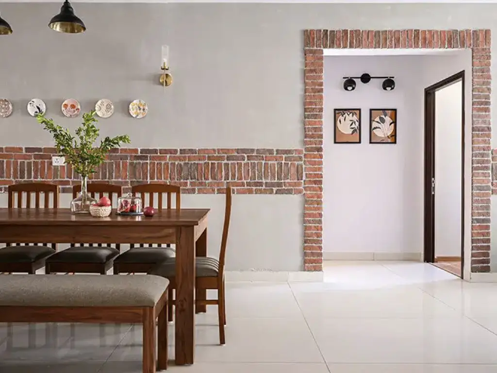 - de la brique sur un mur entier du salon et comme élément décoratif dans la salle à manger,