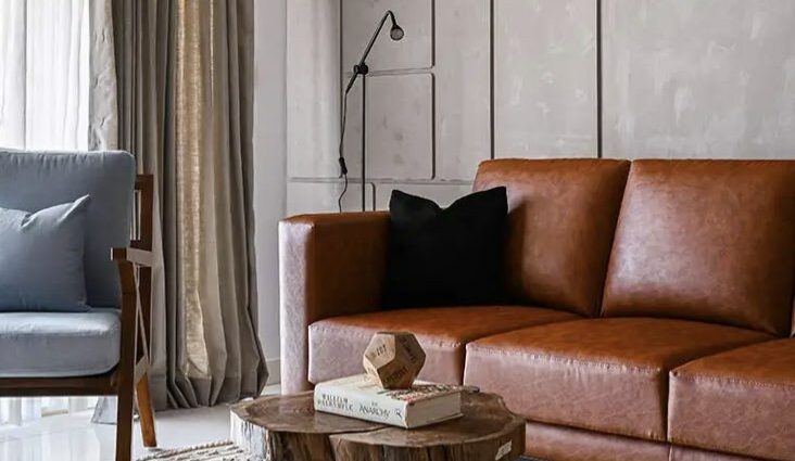 - du béton ciré qui crée un décor original et minimal derrière le canapé en cuir,