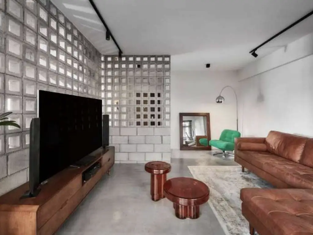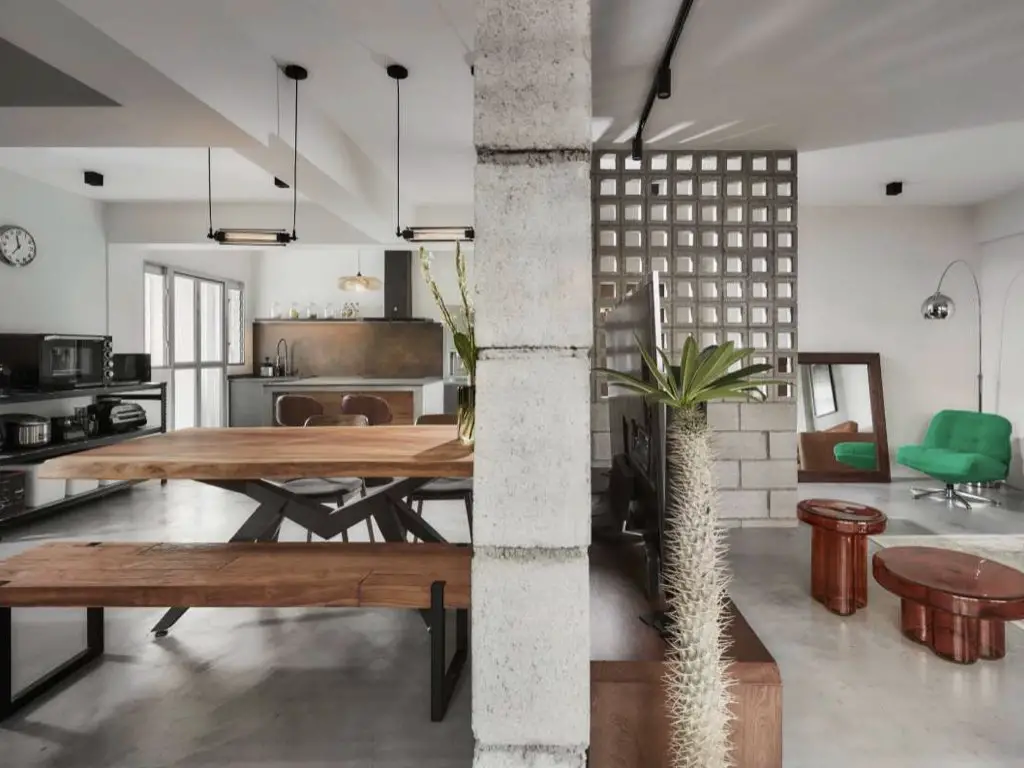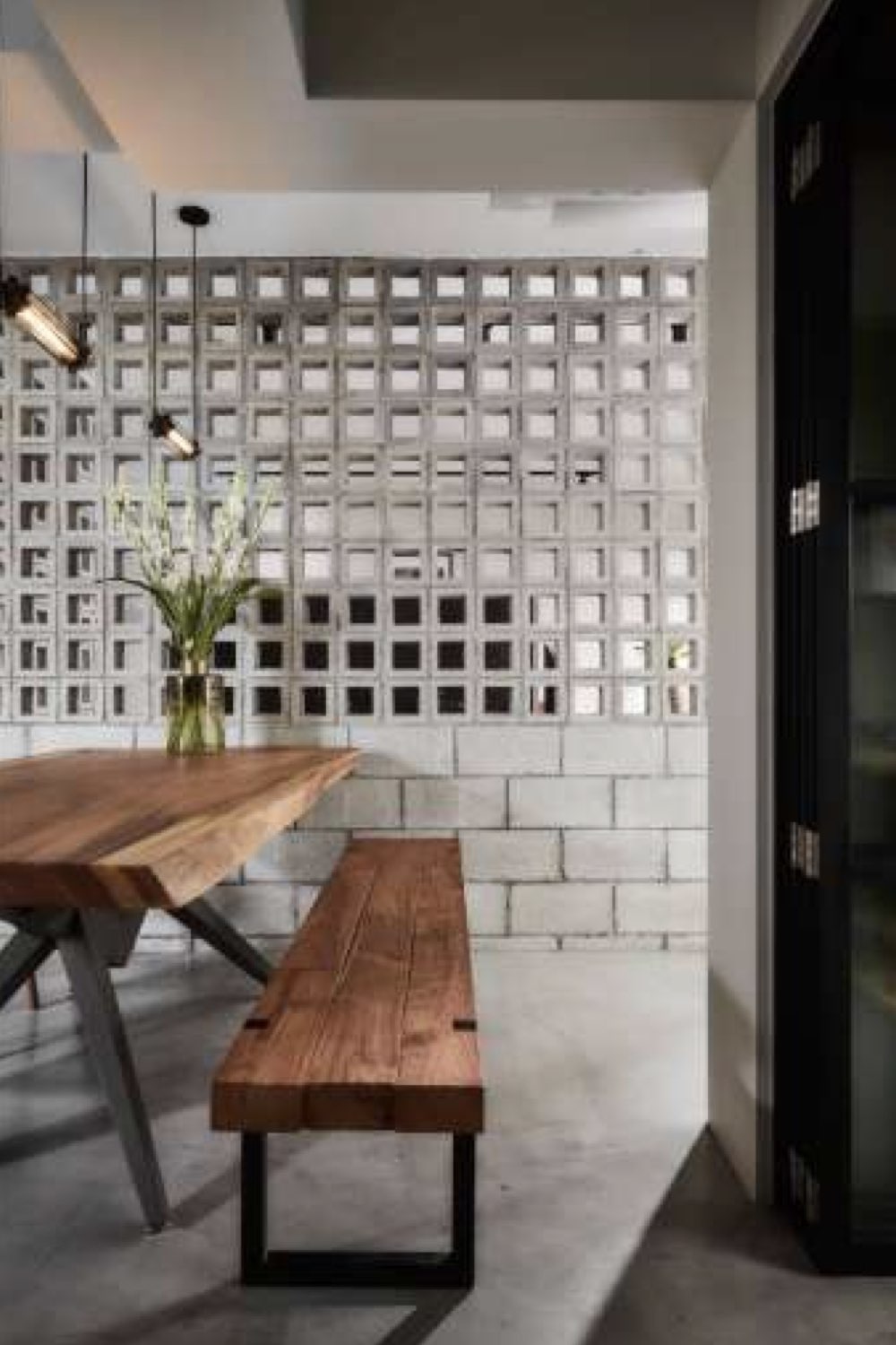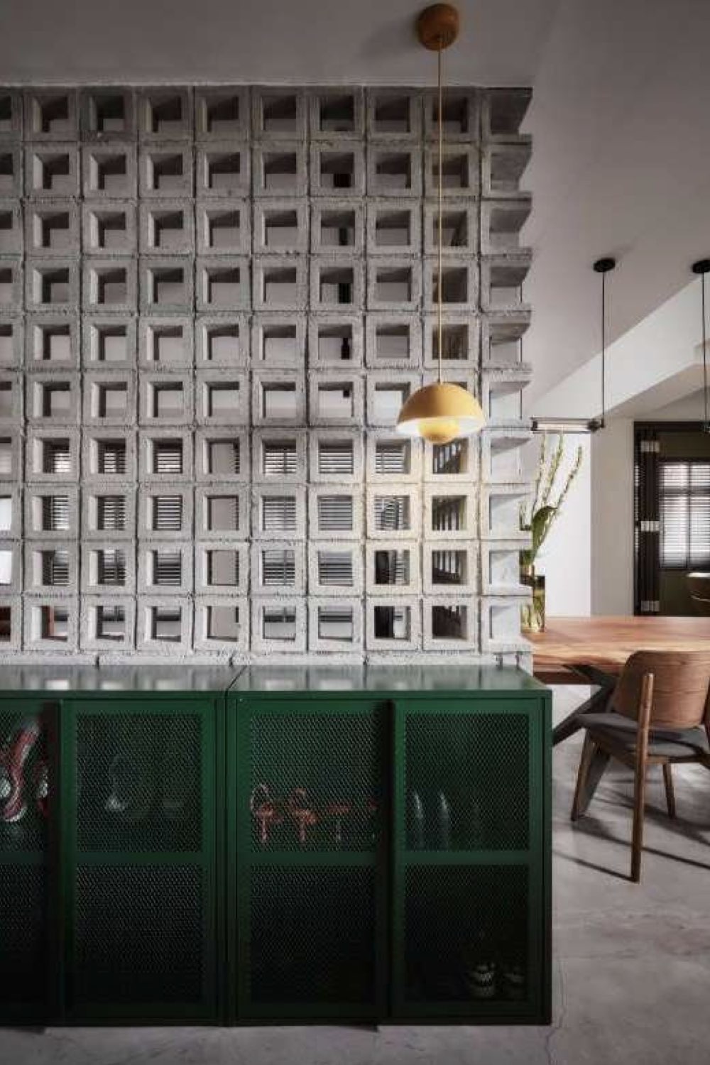 La première chose qui m'a interpelée dans cet appartement est le mur intérieur en parpaings bruts. Un choix qui sort définitivement de l'ordinaire puisque bien souvent le parpaing est dissimulé sous de l'enduit. Ici ce n'est pas le cas du tout. Il est en forme de L pour structurer l'espace et est composé d'un soubassement en parpaings pleins surplombé de parpaings creux qui laissent la possibilité à la lumière de circuler à l'image d'un claustra intérieur.