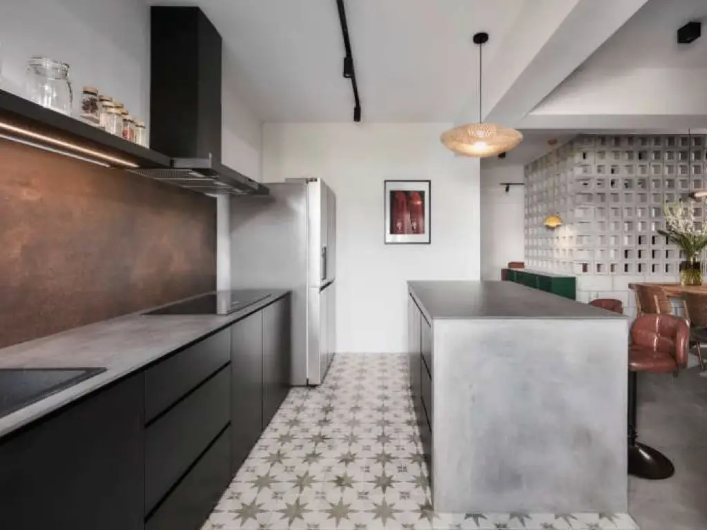 D'ailleurs, en parlant de cuisine, je la trouve intéressante à plus d'un titre. On peut noter par exemple les carreaux de ciment au sol qui offrent à l'espace un côté vintage élégant. La crédence cuivrée et usée est aussi intéressante à regarder. On la voit depuis plusieurs espaces de l'appartement et elle apporte une forme de couleur délicate à l'espace.