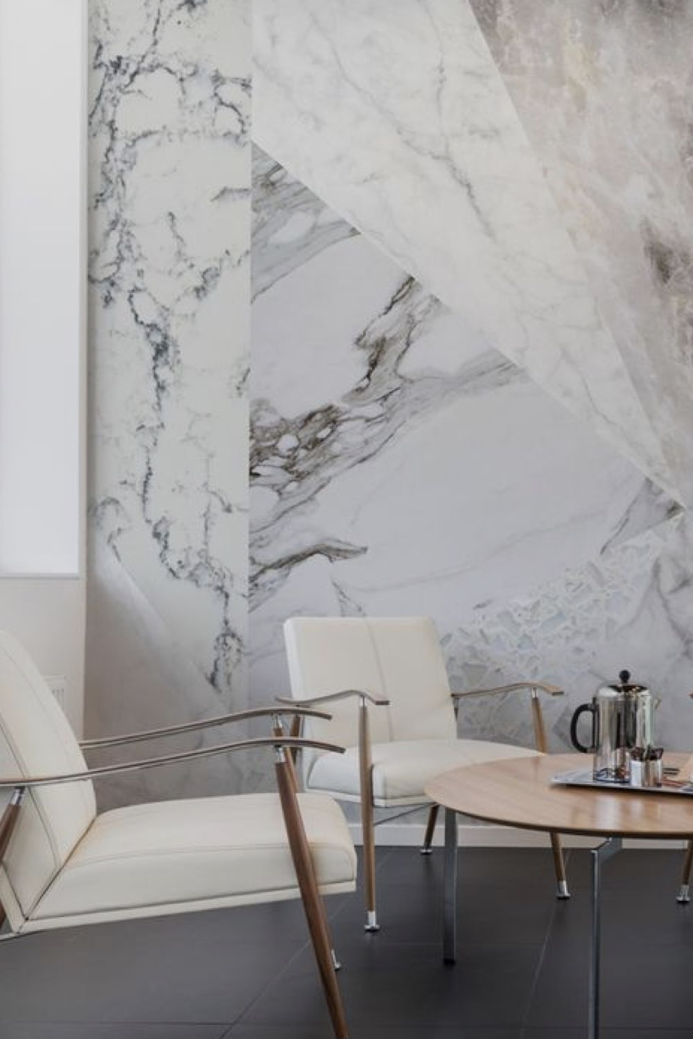 Il est intéressant parce qu'il est composé de veines qui rendent le mur vivant et unique. La palette de couleur du marbre varie du clair au foncé, les veines quant à elles peuvent être dans des coloris variés. Le choix est vaste mais sur les murs, j'ai tendance à préférer le marbre clair pour ne pas assombrir l'espace.