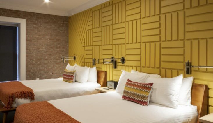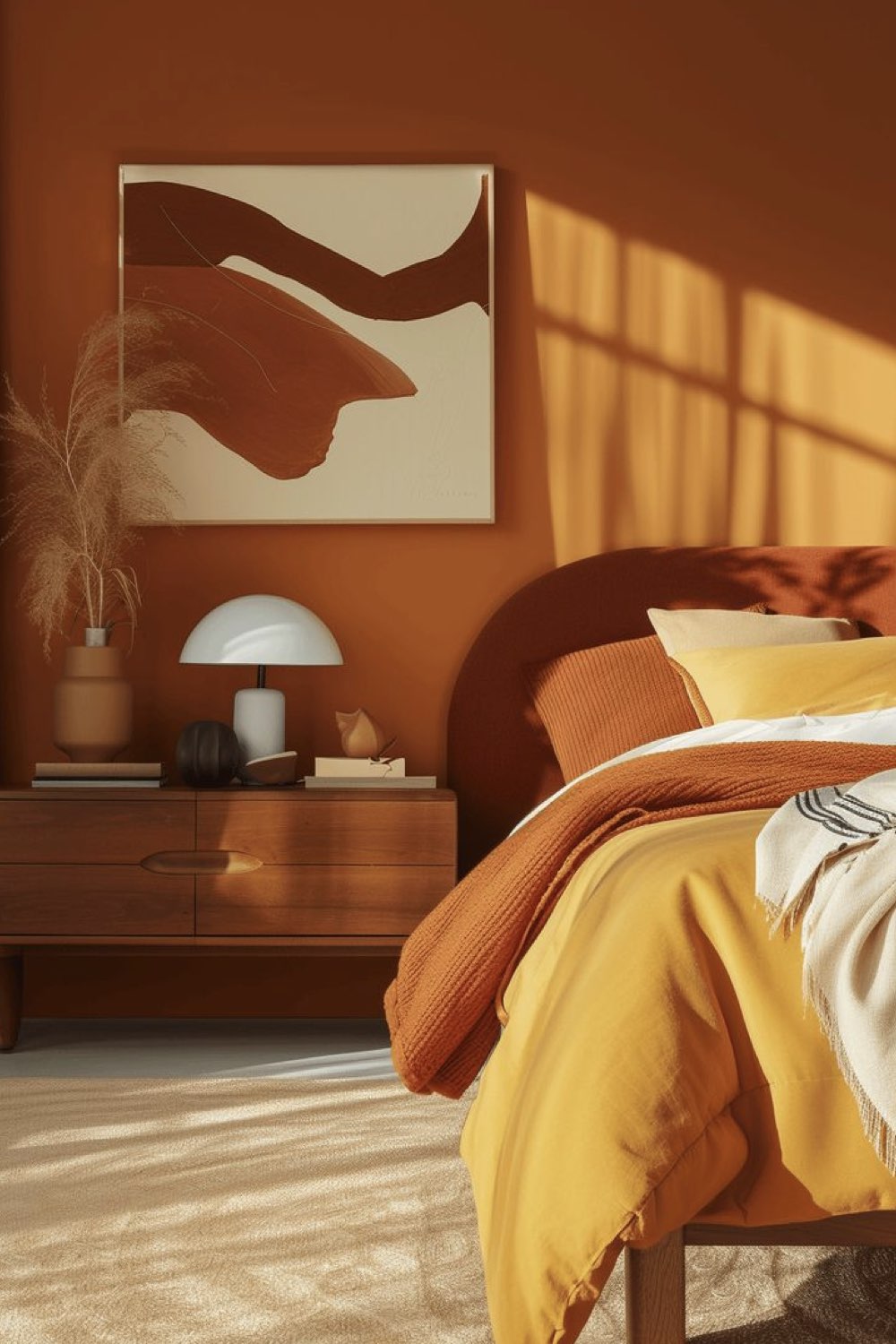C'est un espace où l'on cherche avant tout le calme. Le jaune en grande quantité est donc à nuancer. Si vous tenez absolument à avoir un mur ou plusieurs en jaune, il sera préférable de choisir une nuance plus douce (ex: le jaune moutarde). Autre solution possible, choisir un orange profond en grande quantité et utiliser le jaune comme couleur accent pour dynamiser avec parcimonie votre espace sommeil.
