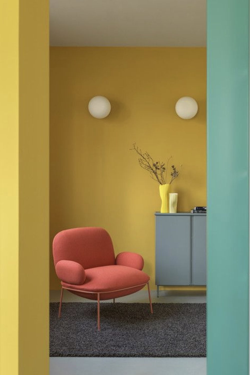 On trouve facilement du bleu ou du vert avec l'association jaune / orange. Cette fois, c'est plus une couleur accent notamment à travers le papier peint. En plus grande quantité, cela va bien dans une salle de jeux ou un bureau. Il y a une idée de naturelle qui est associé à un univers ludique voire arty.