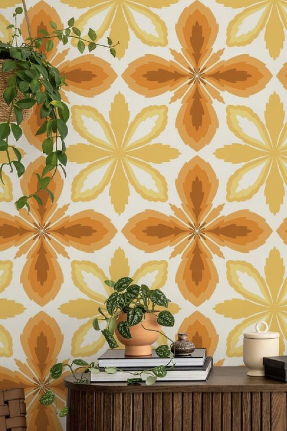 Chez Wellpapers, plusieurs modèles de papiers peints associent le jaune et le orange: Nº350 : Papier peint - Ambiance florissante, Nº467 : Papier Peint - Cadre ondulé (très vintage), Nº534 : Papier Peint - Combinaison Géométrique, Nº328 : Papier Peint - Petit soleil (existe aussi uniquement en jaune), Fresque Colorée.