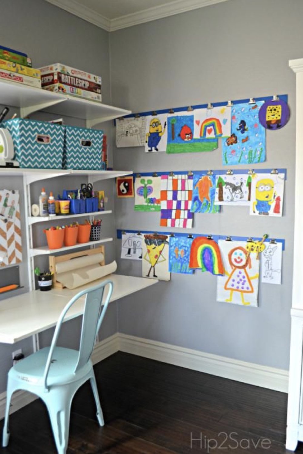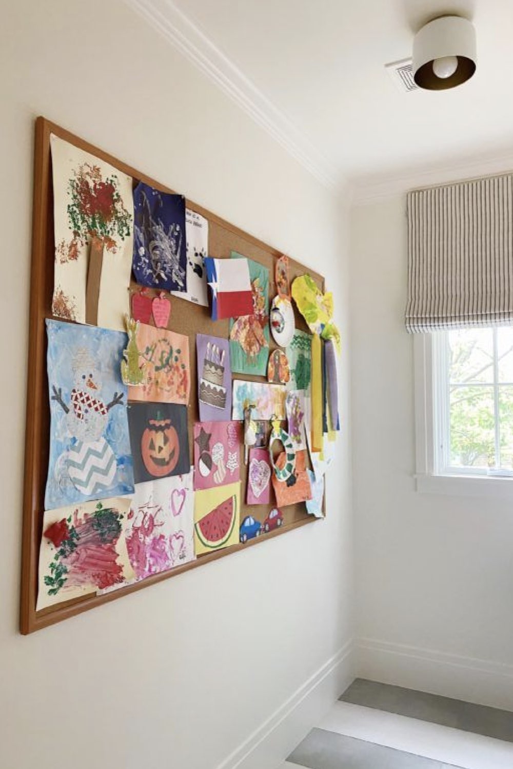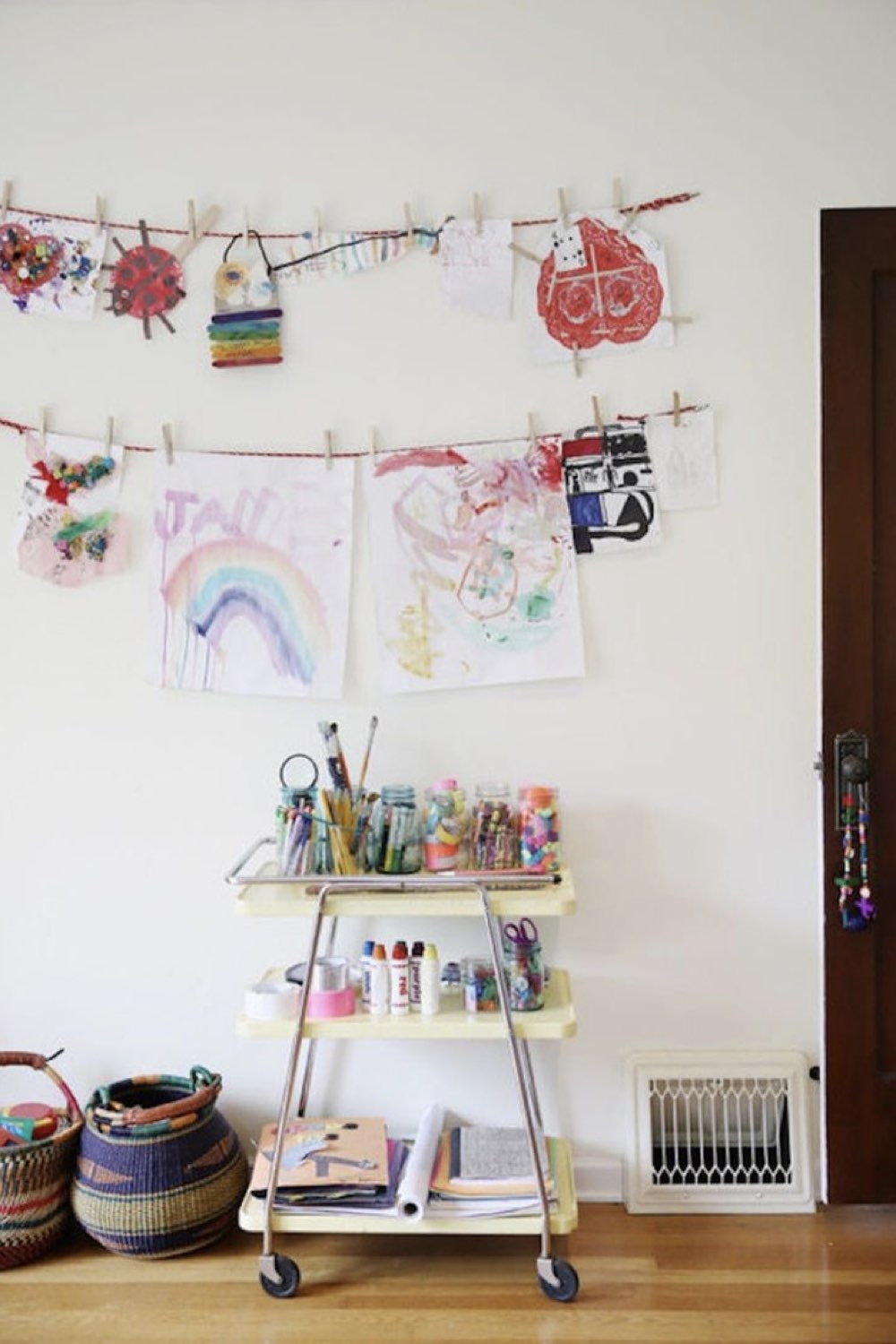 Toutes les pièces se prêtent à ce type de déco - même si les pièces humides comme la salle de bain, c'est moins fréquent (mais pas impossible). Dans l'entrée, les dessins donnent le ton immédiatement d'une maison familiale où les enfants peuvent s'exprimer librement. Dans le salon, les oeuvres de votre kid contribueront à l'idée de vie relative à la pièce. Idem pour la salle à manger.