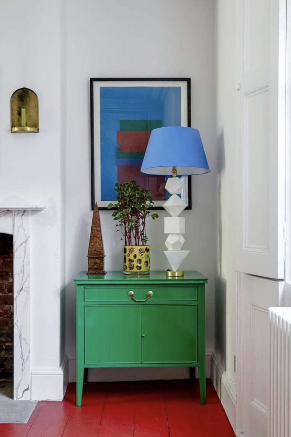 Et je commence cet article avec un pourquoi. Pourquoi utiliser un combo bleu et vert? Dans l'exemple sélectionné, l'association de couleurs se trouve dans une pièce dont les murs sont blancs. Le meuble relooké en vert, l'abat-jour et l'affiche encadrée sont en bleu. Le tout crée une explosion de couleurs dans un angle spécifique de l'espace. Ces couleurs dénotent et attirent notre regard. La cheminée passe au second plan. Ici l'association de couleurs offre à ce coin de pièce une dimension particulière.