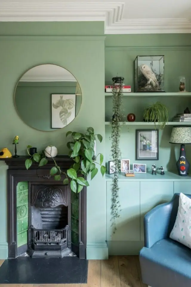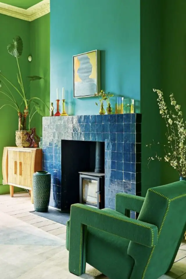 En plus de mettre l'accent sur la cheminée, l'utilisation de deux tons de bleus dans une pièce verte offre une certaine dynamique à l'espace.