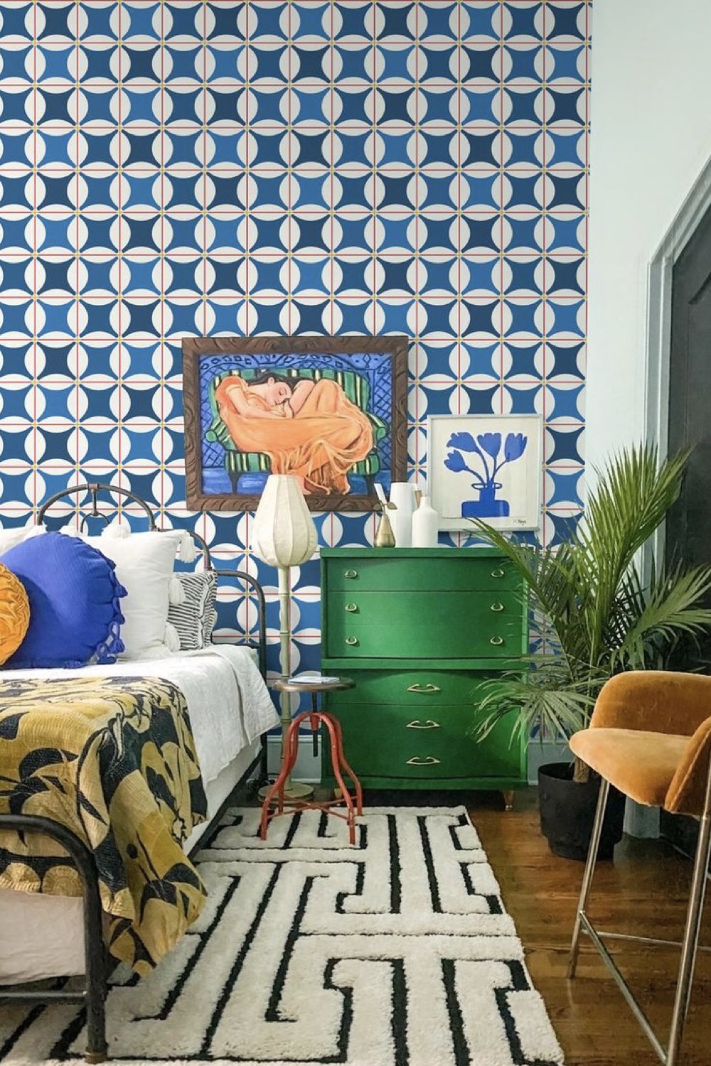 Jusqu'à présent on a parlé de meubles, d'accessoires décoratifs, de peinture. Il y a aussi le papier peint qui peut être source de motif. Dans cette 3ème idée pour décorer avec du bleu et du vert, on est sur un papier peint à motifs géométriques bleu et blanc dans une chambre pour créer un mur accent et offrir une place particulière au mur contre lequel se trouve le lit. Il y a le lit qui est très discret (la tête de lit en métal se fond avec le papier peint). Il y a aussi une commode / chiffonnier qui ressort bien plus avec un vert franc.