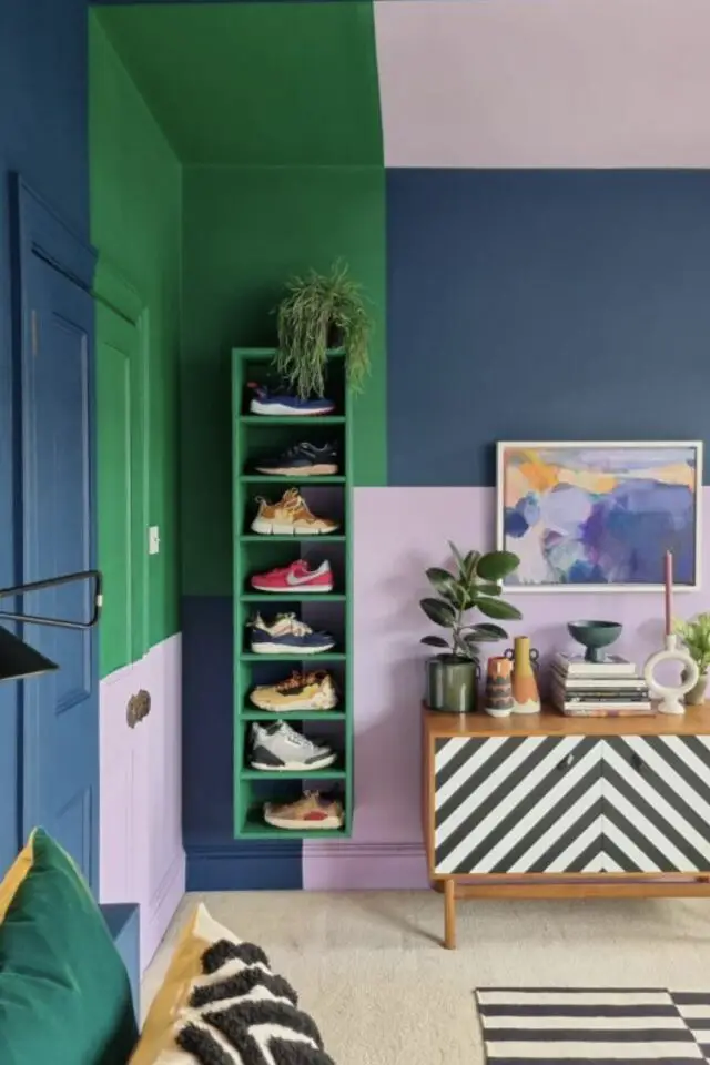 Les deux précédents exemples vous montraient de grands aplats colorés. Dans cette entrée qui n'est pas cloisonnée et qui est ouverte sur une pièce à vivre, la couleur n'est pas tout à fait utilisée de la même manière. Les murs sont découpés de manière graphique avec de grands rectangles colorés. Le bleu nuit, le vert bouteille côtoient un parme qui est plus doux (et plus inattendu) que le blanc.