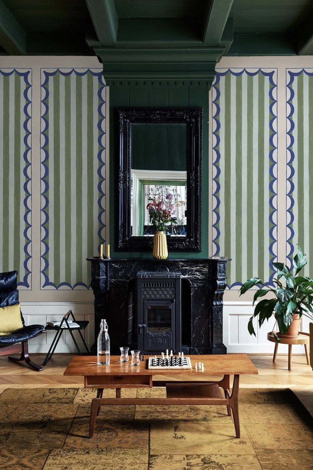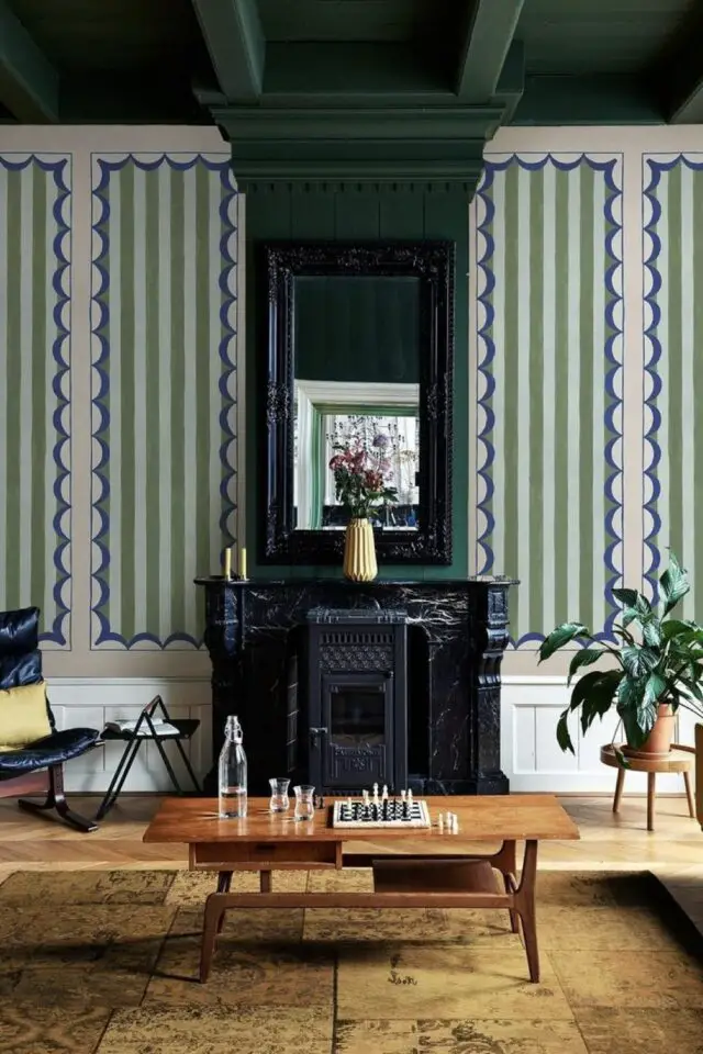 Et au niveau du mur, on a une combinaison de verts et de bleu assez inattendue grâce à des panneaux muraux. Deux verts plus clairs que la cheminée pour les rayures. Un bleu tendre mais pas pastel pour l'encadrement. La géométrie des panneaux crée un contraste. Les rayures peuvent très bien être classiques comme tendances. En revanche, la cannelure bleue sort de l'ordinaire. Elle est bien plus contemporaine que le reste de la décoration murale. En utilisant des couleurs analogues, on peut facilement se permettre une dose d'originalité, d'inattendu. La douceur qui provient de l'association de couleur atténue le contraste ancien / moderne.