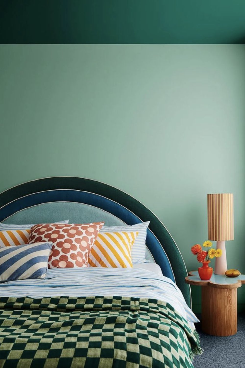 Autre élément qui peut vous aider à associer vert et bleu dans la chambre: le linge de lit.