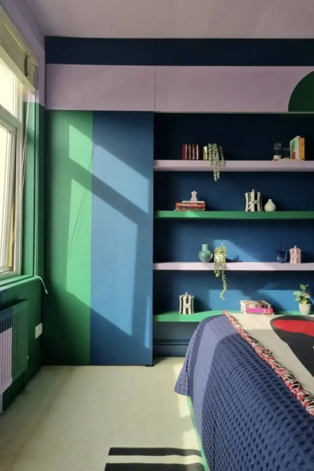 Souvent, on tend à une déco de chambre simple pour éviter le sentiment d'encombrement qui ne favorise pas l'endormissement. Dans cette chambre à coucher, il y a un équilibre. Certes, il y a de la couleur et elle est utilisée de manière qui sort de l'ordinaire mais il y a peu d'objets décoratifs sur les étagères. Une certaine forme de minimalisme qui côtoie le maximalisme de la couleur.