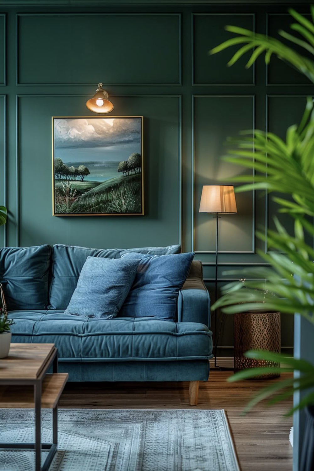 Mur et moulures en ton sur ton dans une nuance de vert sauge mat. Un canapé en velours bleu , quelques coussins pour le confort. Le tableau qui représente un paysage au dessus du canapé reprend ces tonalités. Il est mis en valeur par une applique murale.
