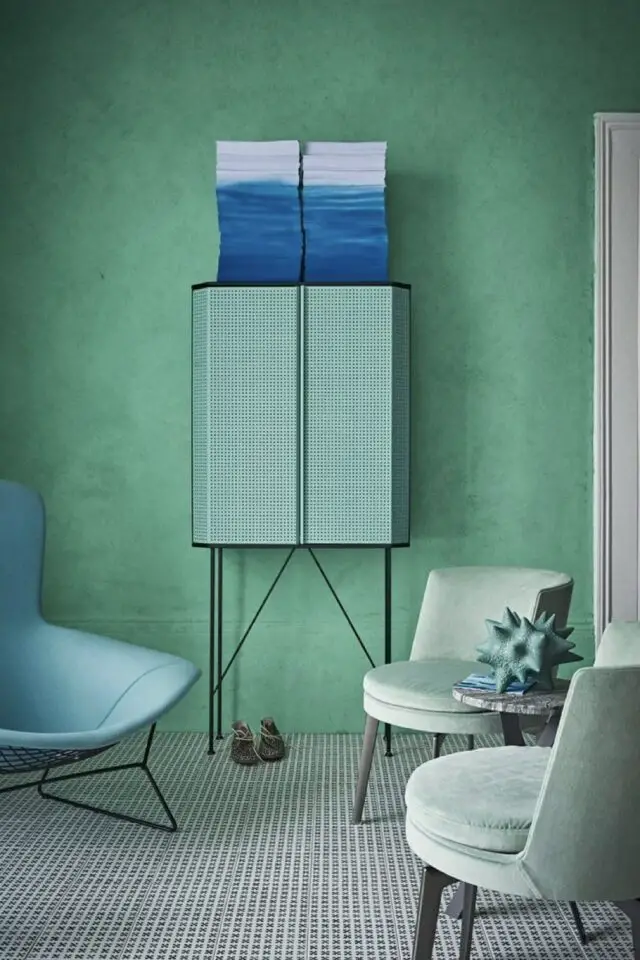 Dans l'exemple sélectionné, nous sommes sur des nuances de couleurs assez tendres, douces et lumineuses. La pièce (mur et meubles en ton sur ton) est verte, une nuance qui s'approche du céladon. Et dans la continuité on trouve un fauteuil bleu vintage. Il n'y a pas de contraste violent et marquant. C'est un ensemble harmonieux qui dénote avec douceur. Le fauteuil ressort aussi grâce à son revêtement plus brillant que la peinture utilisée. Il contribue à l'effet lumineux de l'association de couleurs.