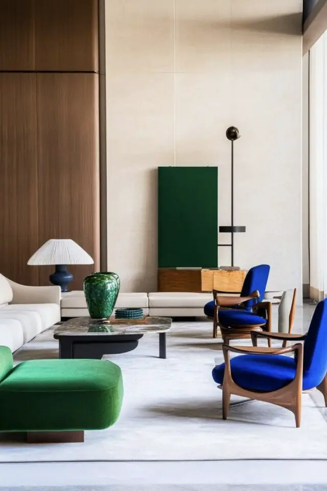 Fauteuils bleu cobalt et méridienne verte en velours pour un salon chic et design