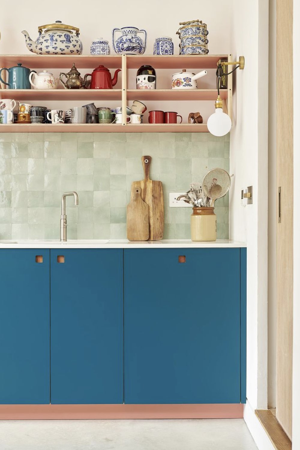 Autre solution pour une crédence carrelé: le carrelage métro. Je n'ai pas choisi d'illustrations avec du carrelage blanc, je ne peux plus le voir en peinture (je vous parlais d'overdose plus haut, c'est ce qu'il se passe pour moi). Le carrelage métro est rectangulaire. Il peut facilement se trouver coloré et on peut s'amuser avec la pose du carrelage pour créer différents effets visuels. La pose en chevron par exemple demande pas mal de découpe mais offrira une certaine élégance à votre espace.