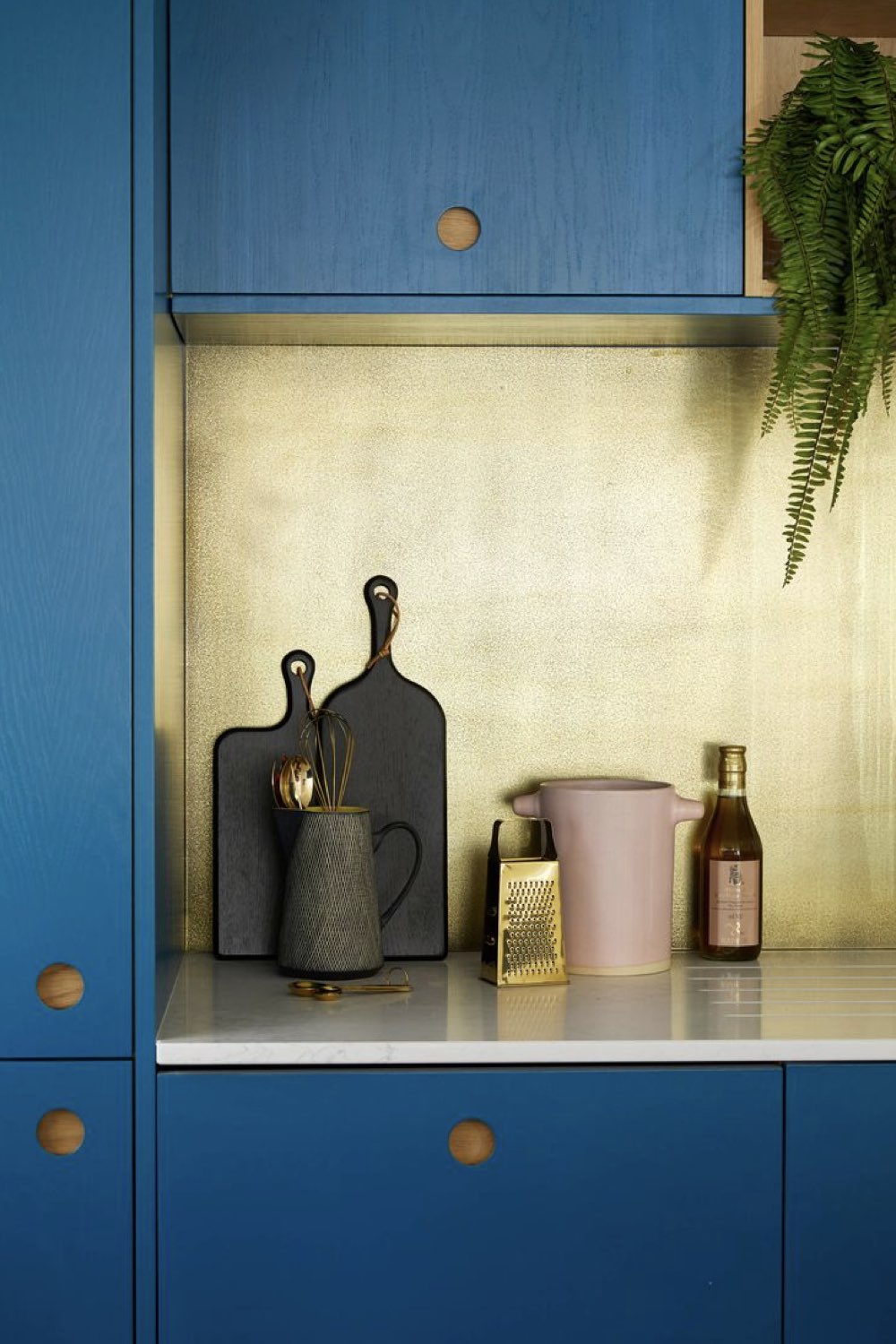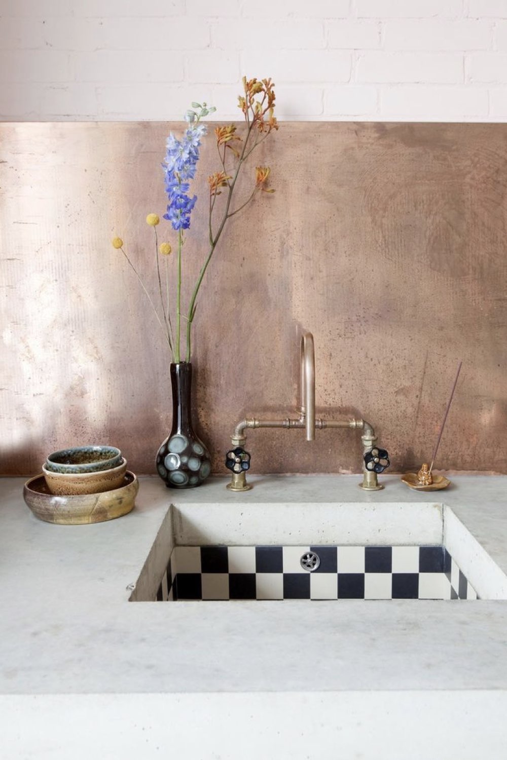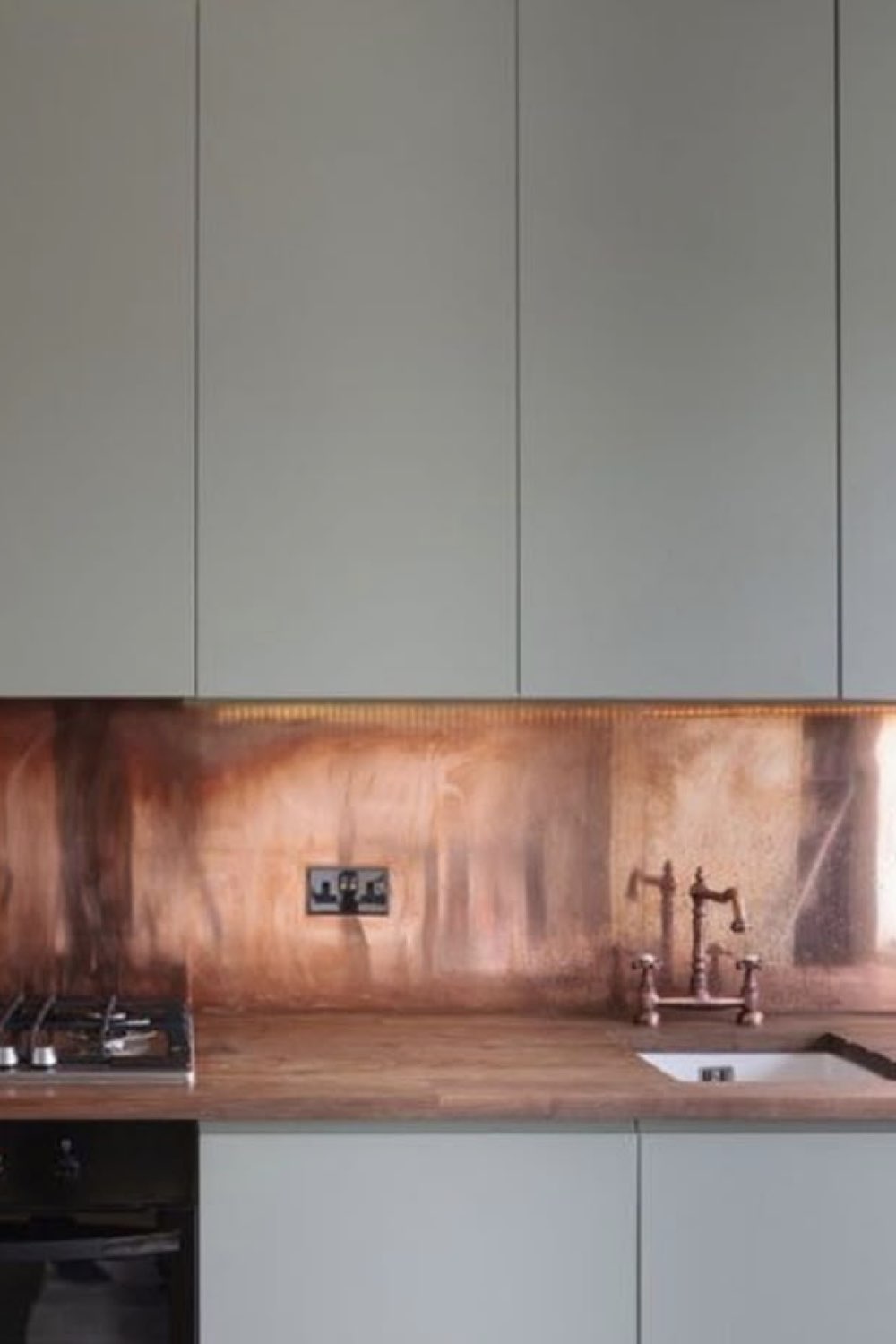 Dans le même esprit que le métal doré, on a le métal cuivré. J'ai une sympathie toute singulière pour ce type de crédence parce que c'est une manière de faire un clin d'oeil aux vieilles casseroles en cuivre que l'on utilisait avant pour cuisiner. Il y a également un effet plus enveloppant avec le cuivré, moins de bling-bling sans perdre en élégance. Vous trouverez un exemple de cuisine ouverte avec un crédence cuivré dans cette visite déco.