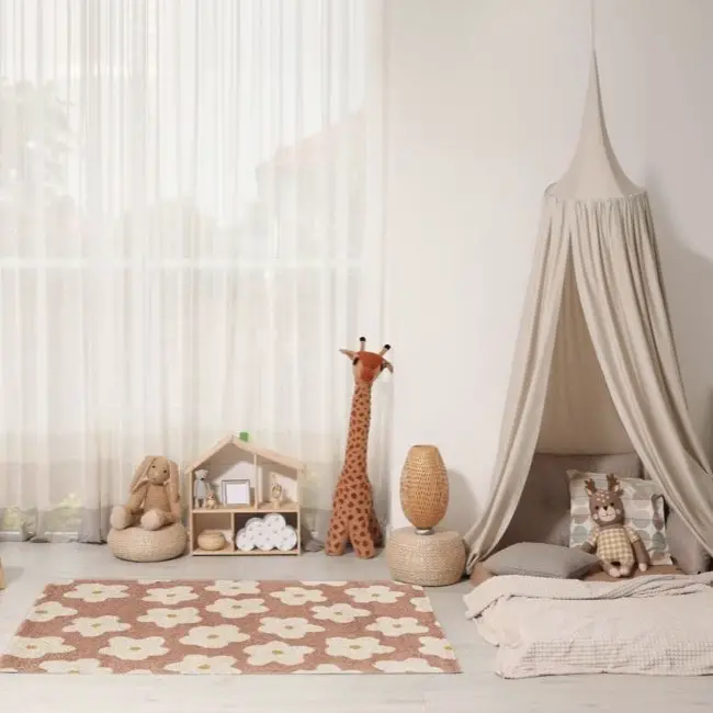 On y pense moins que les luminaires ou le linge de lit, dans la chambre d'enfant, les tapis et descentes de lit peuvent être un petit geste déco qui vous permettra de parfaire la déco de chambre.