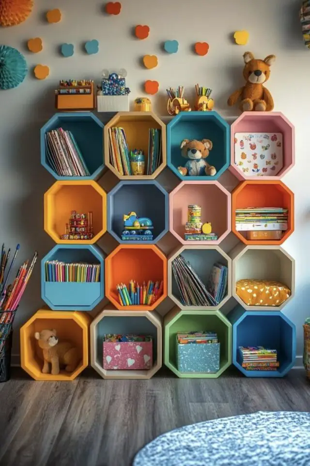 J'aime l'idée des étagères murales quand les enfants ont des jouets / décors. Je pense par exemple aux constructions de Playmobile ou en Lego. L'étagère murale permet de leur donner une place sans encombrer l'espace chambre.