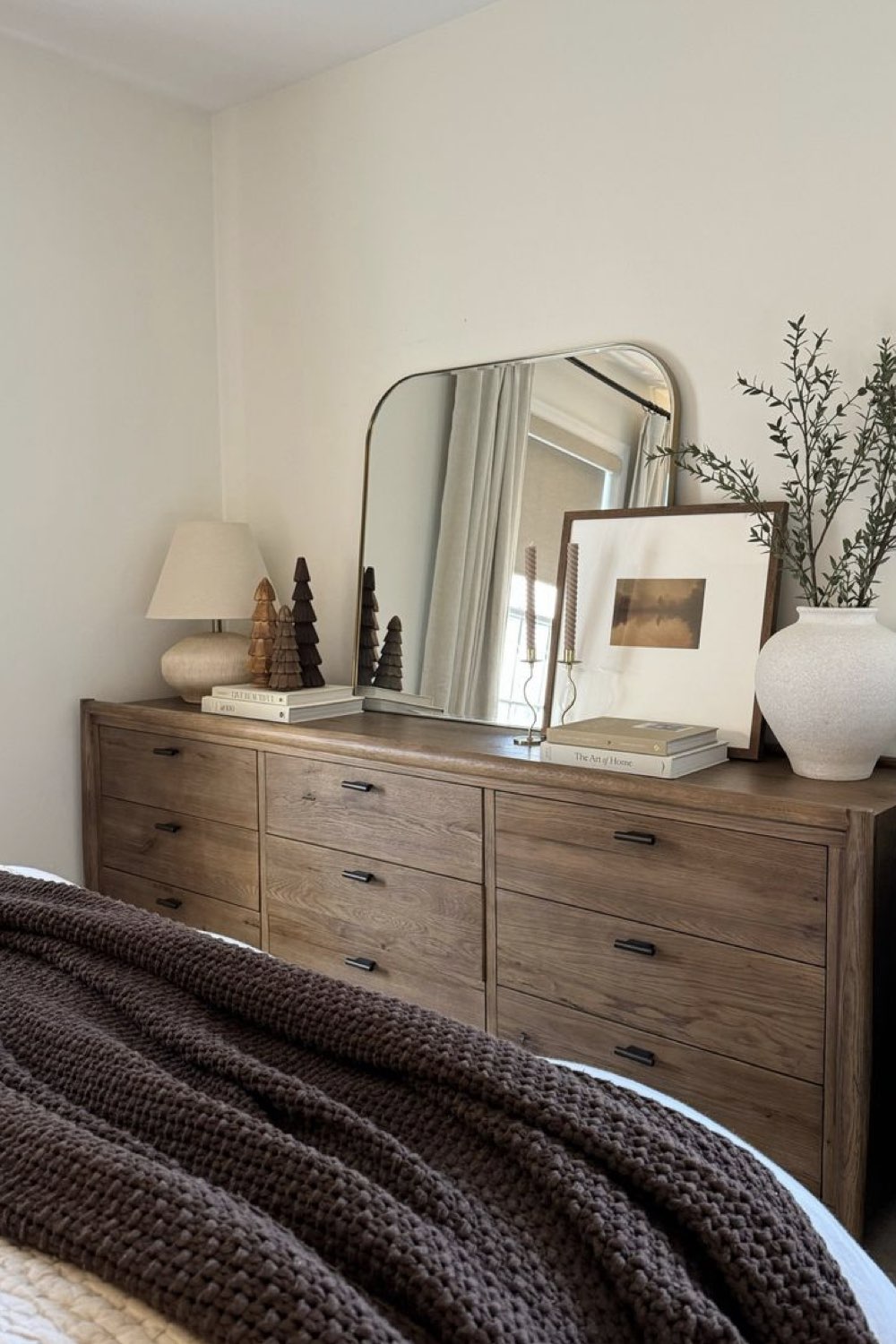 Au dessus de la commode, si percer un mur ne vous dérange pas, vous pouvez fixer un miroir au mur ou encore créer une galerie de cadres. J'aime particulièrement les éléments qui sont relatifs à la famille dans une chambre (dessins d'enfant, photos de vacances, etc.) Il y a quelque chose de doux et réconfortant dans cette idée qui colle bien avec l'univers personnel qu'est la chambre.