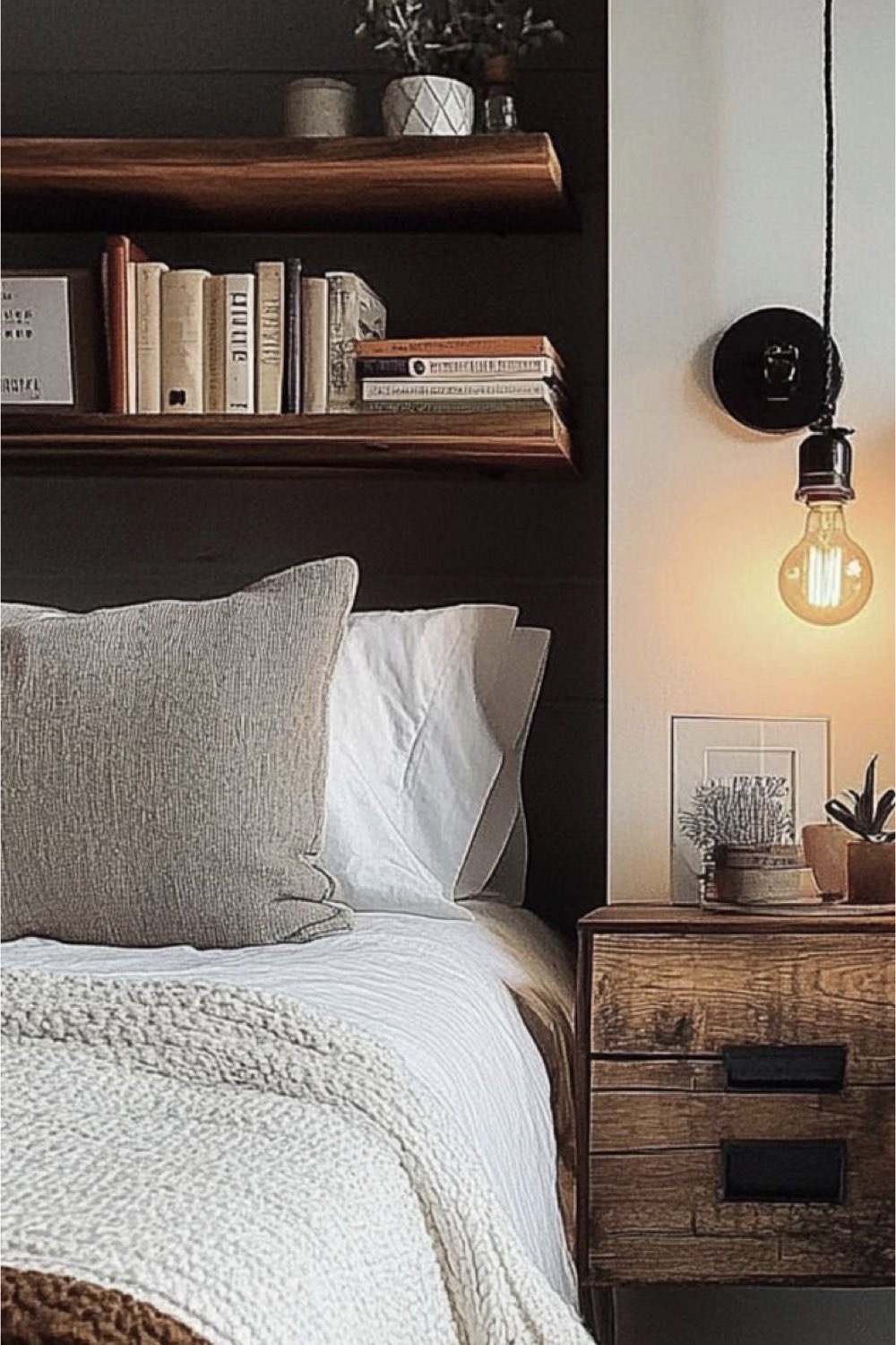Je reste sur l'idée d'étagère mais pas nécessairement au dessus du lit. Une petite étagère peut être une alternative plus minimale à une table de chevet. Un ensemble de tablettes solidement fixées au mur peuvent servir de bibliothèque. De petites étagères fines vous permettront de poser de la déco à différentes hauteurs.