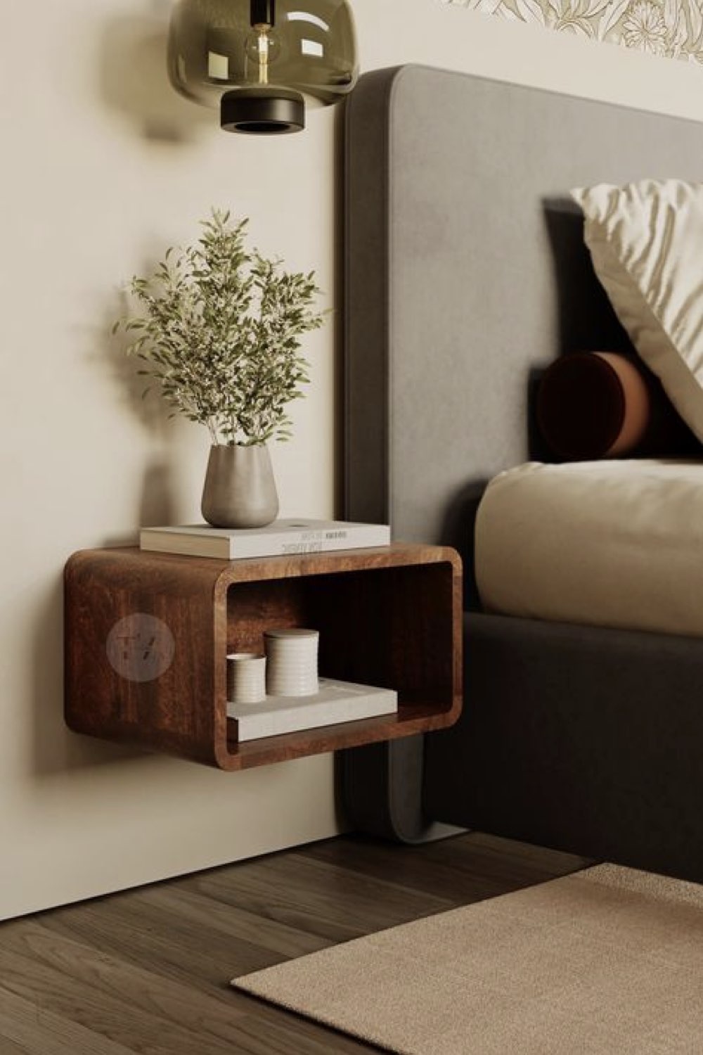 J'ai déjà évoqué la question de la table de chevet cependant comme dans cette partie, il est question de décoration murale, on peut parler des tables de nuits flottantes. Elles se caractérisent par l'absence de pieds et une fixation murale. C'est une solution intéressante pour les petites chambres ou les espaces qui semblent trop encombrés.