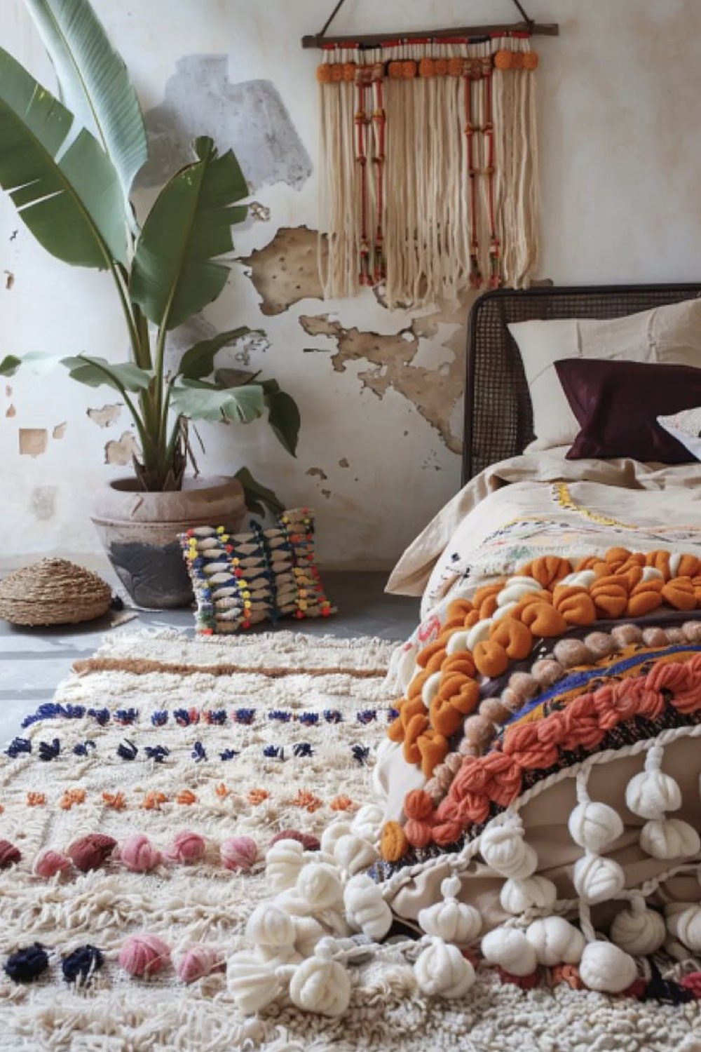 - De la déco bohème: macramé, plateaux en fibres tressées, chapeau de paille, juju hat...
