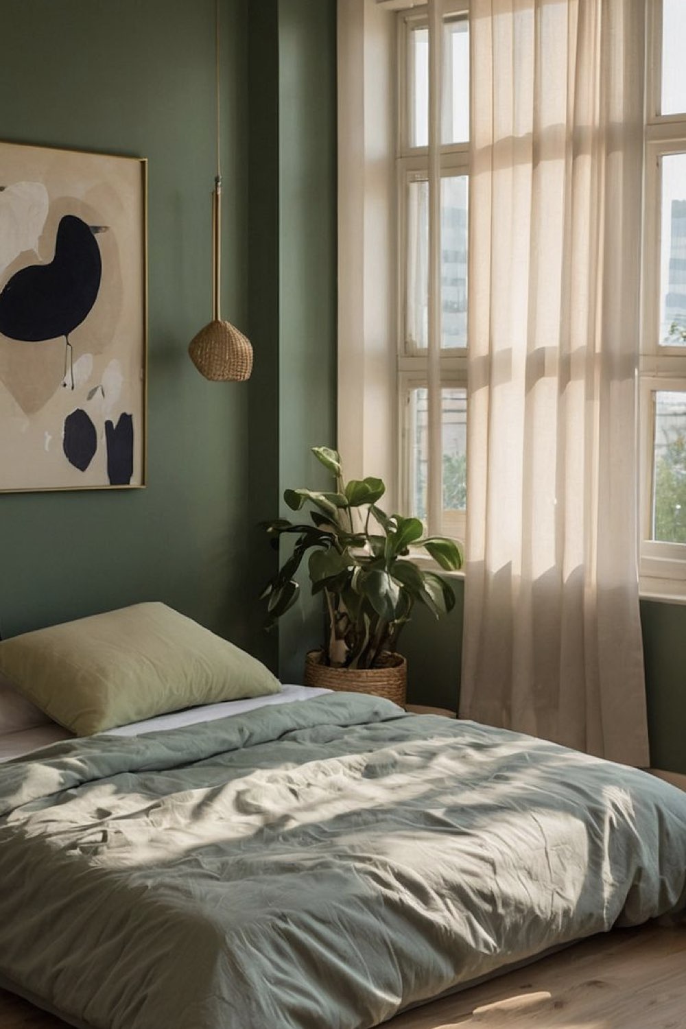 Une chambre parentale aux tonalités naturelles grâce au vert