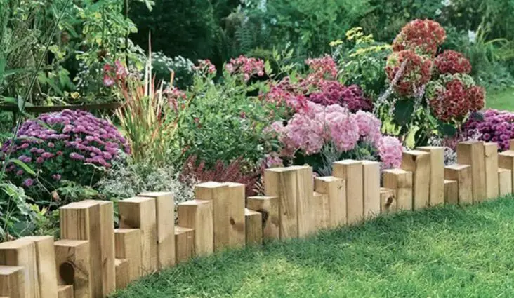 Voici un exemple de bordure qui sort de l'ordinaire et qui est très déco je trouve. C'est une double bordure. D'un côté, on a des bastaings en bois posés à la verticale avec des hauteurs différentes pour retenir la terre du massif qui est sur-élevé par rapport à la pelouse. Et au niveau du sol, une bordure faite avec de petits cailloux. Ce type de double bordures a des avantages esthétiques et pratiques. C'est une solution intéressante si vous souhaitez apporter du volume à votre jardin.