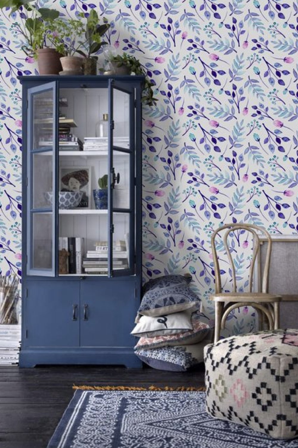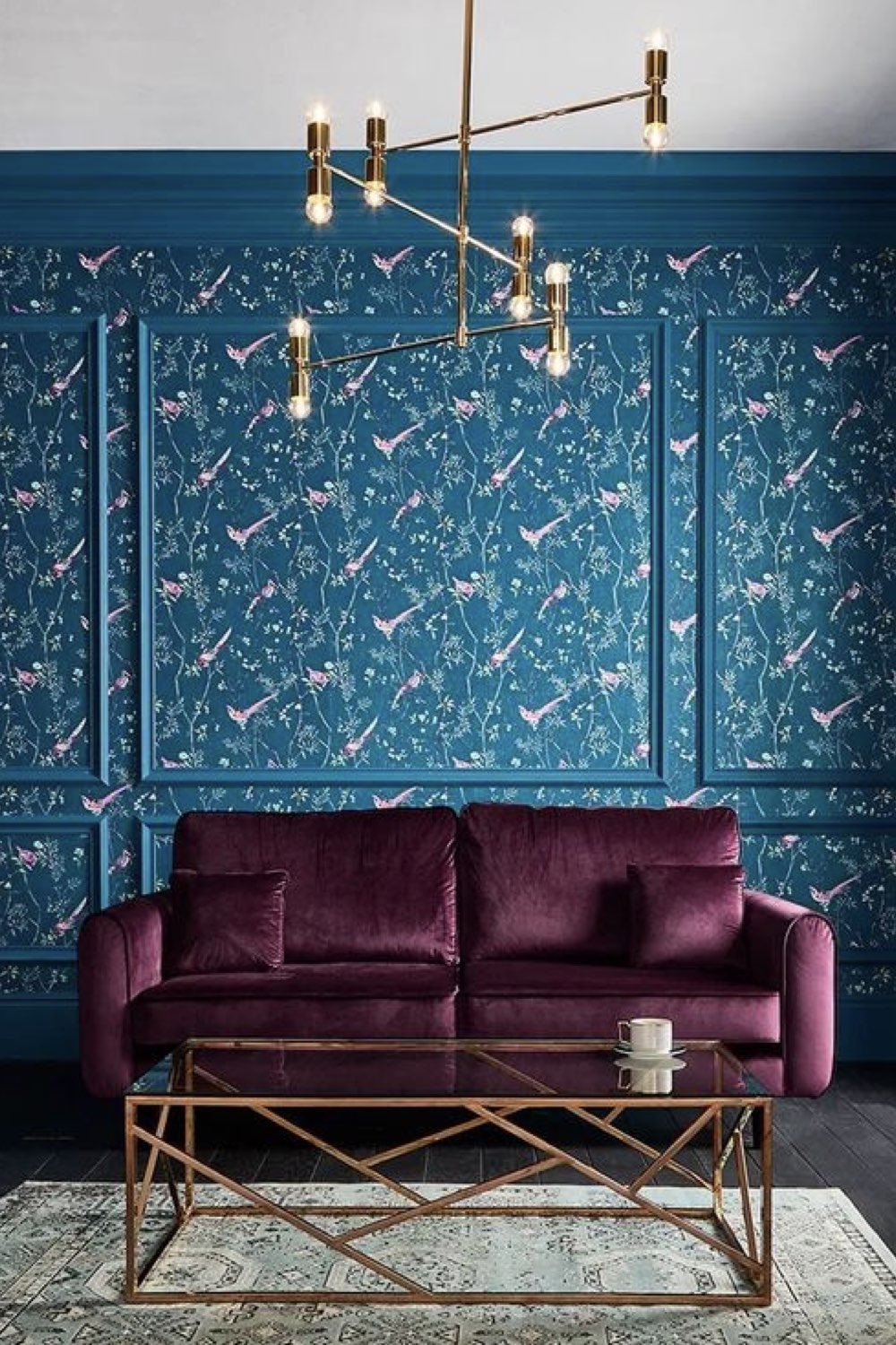 Ensuite, il suffit de trouver une couleur pour le mur contre lequel est posé le canapé. Cette couleur peut très bien être de la peinture ou du papier peint. Si vous préférez que le bleu et le violet soient des couleurs secondaires et / ou accents, la déco murale peut être source de couleurs (les affiches par exemple sont une piste à explorer).