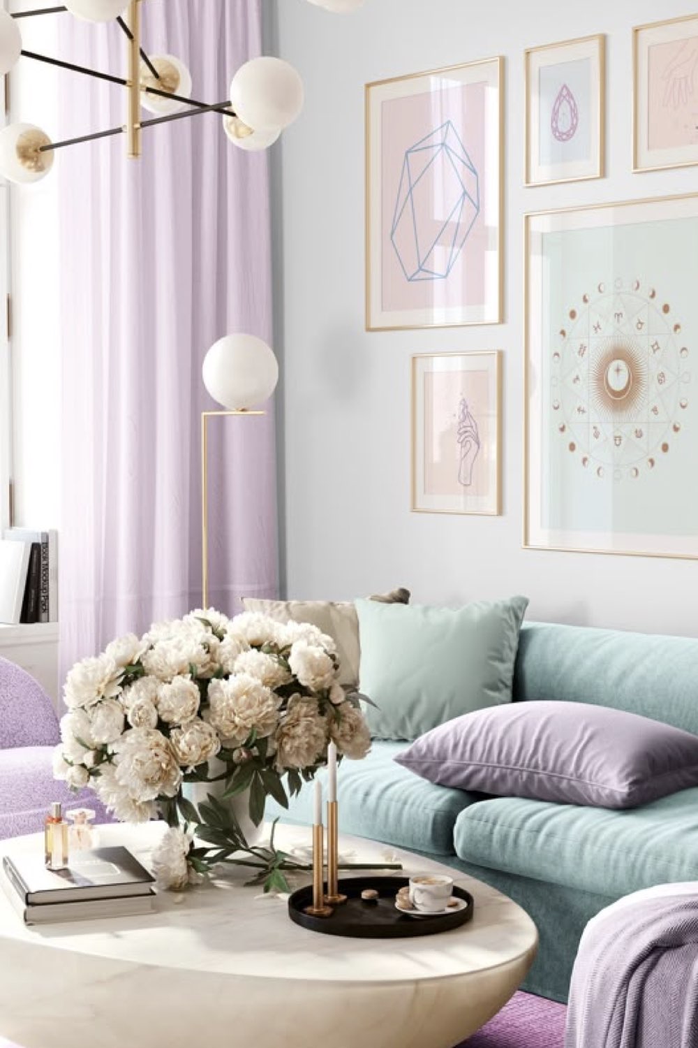 Les nuances sourdes ne sont pas la seule possibilité qui s'offre à vous pour décorer une pièce à l'aide de violet et de bleu. On peut aussi facilement partir sur des tonalités plus claires. Là aussi elles offriront à votre espace un sentiment de tranquillité et de sérénité. Cependant, dans des nuances pastels, elles peuvent offrir une certaine candeur à l'espace (ça marche très bien pour les chambres d'enfants par exemple). L'un des avantages à utiliser des couleurs claires, c'est qu'elles ne vont pas "rapetisser" la pièce, autrement dit l'espace ne vous semblera pas plus petit. Avec une couleur dominante comme le blanc, le violet associé au bleu vous permettront de conserver un espace lumineux.