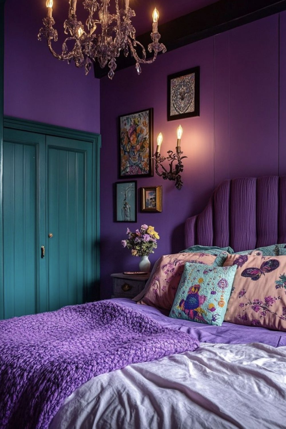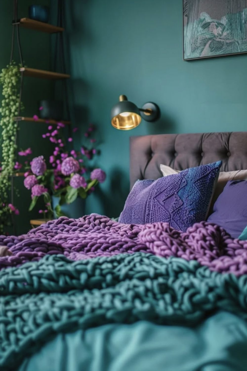 Le bleu est une couleur souvent utilisée dans la chambre parce qu'il évoque souvent le calme et la quiétude. J'aime aussi beaucoup le bleu canard dans cet espace. Il est peut-être moins attendu que le bleu. Le violet, surtout dans ces nuances les plus sombres ont quelque chose d'intéressant. J'aime le côté intime qui colle parfaitement avec l'univers de la chambre. Et puis les couleurs sourdes sont apaisantes, enveloppantes.