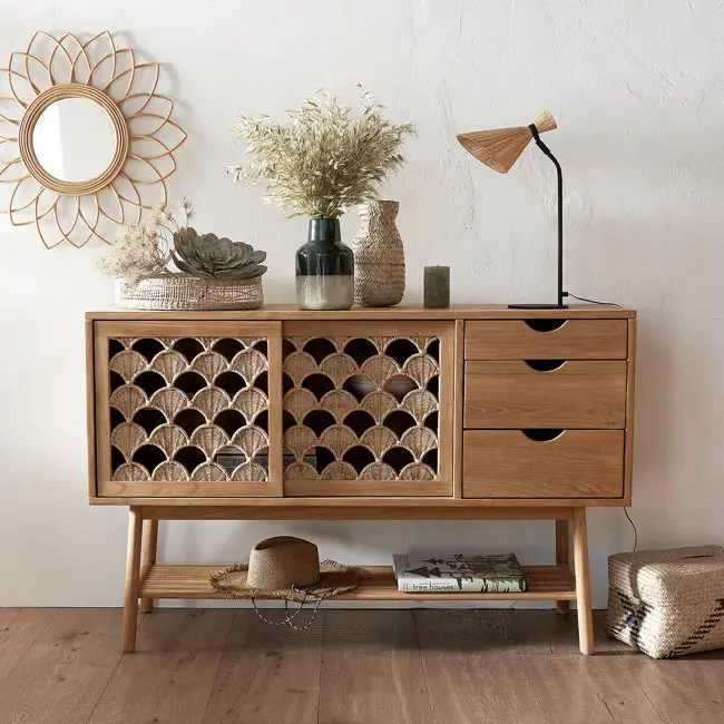 C'est la même chose pour le mobilier. Choisir de jolis meubles qui répondent à nos besoins - notamment des besoins de rangement. Même si on reste sur une base neutre et chaleureuse dont je parlais juste avant. Il est assez facile de trouver un meuble en bois qui correspond à nos besoins. Toujours dans l'espace de vie, vous pouvez ajouter un buffet, une enfilade, un vaisselier, une vitrine... Chaque meuble offre une esthétique particulière mais aussi des possibilités de rangement différentes. Et de cette manière, on garde l'une des caractéristiques phares du style scandinave.