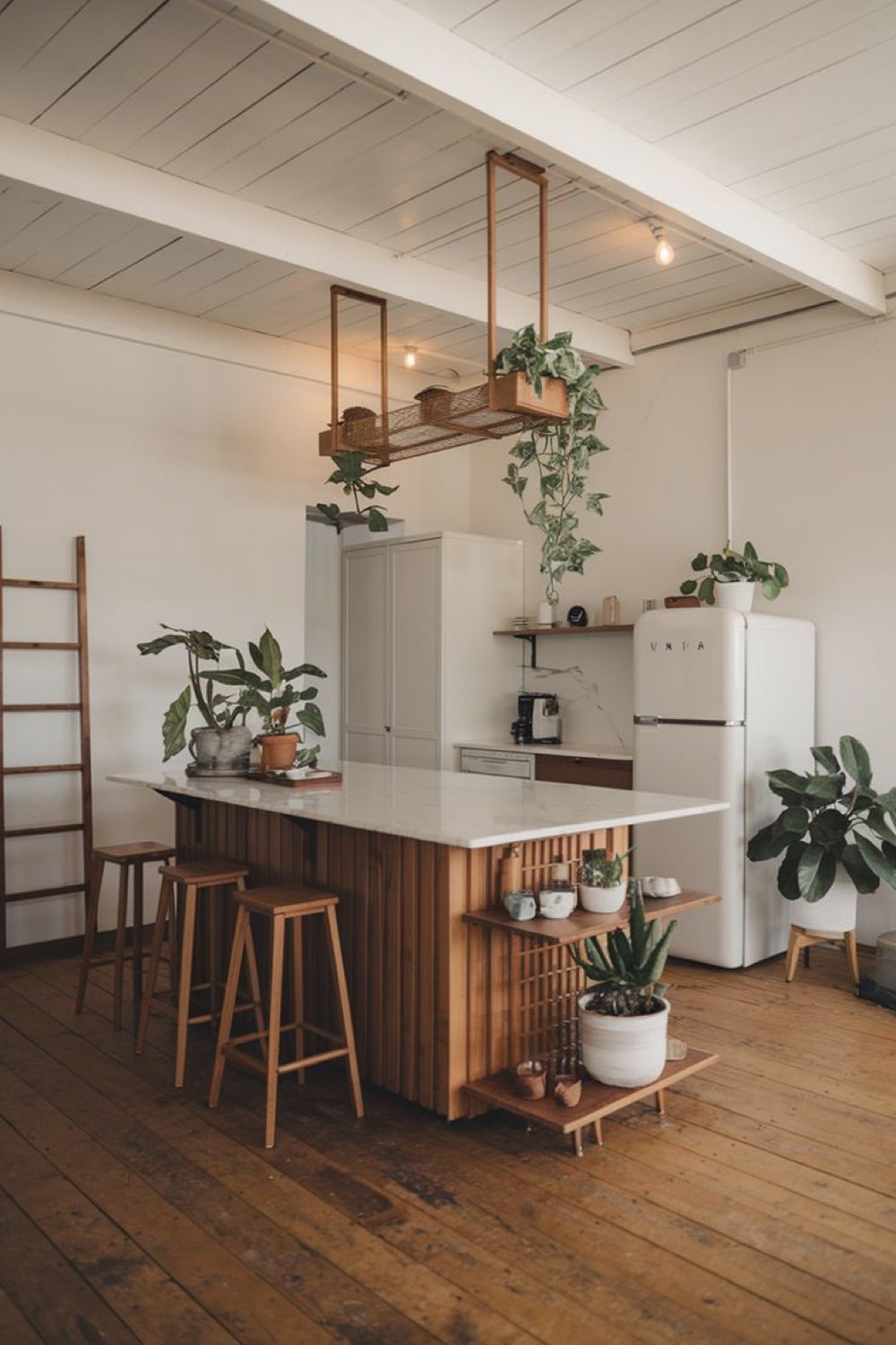 Les plantes jouent un rôle central, qu'il s'agisse de grandes feuilles de monstera suspendues, de cactus dans des pots en terre cuite ou encore de petites plantes grimpantes qui ornent les murs. En ce qui concerne les textures naturelles, telles que les tapis en jute, les coussins en lin ou les rideaux légers en coton, apportent confort et chaleur.