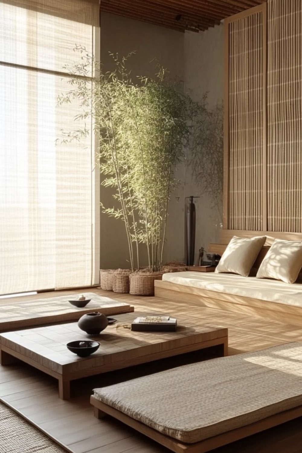 Les objets décoratifs sont réduits à l’essentiel : une sculpture en bois, une bougie en cire naturelle ou un vase en céramique. Cette approche minimaliste crée un cocon de tranquillité, où chaque détail contribue à la sensation d’espace et de calme, tout en célébrant la beauté simple et naturelle des éléments qui nous entourent.